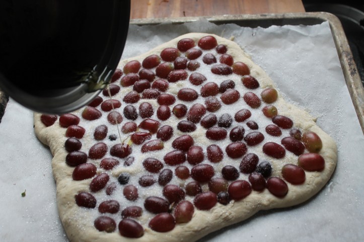 Þetta er ein af þessum ofboðslega einföldu uppskriftum sem er samt til í ótal útgáfum sem allar eru jafn ekta ítalskar. Ég hef alltaf gert það úr ósætu gerdeigi en það er líka hægt að gera það úr sætu gerdeigi og jafnvel lyftiduftsdeigi. Stundum er helmingurinn af álegginu settur á hálft deigið, hinn helmingur deigsins brotinn yfir og afgangurinn af álegginu settur ofan á. Stundum er áleggið bara vínber, sykur (eða hunang) og ólífuolía. Stundum er bætt við rósmaríni, muldum valhnetum, anís og fleiru. Stundum er notaður heldur minni sykur en hér, stundum mun meiri. Og eiginlega á ekki að nota steinlaus vínber því að það er partur af bragðinu/upplifuninni að bryðja steinana og finna þá bresta. Fyrir utan að steinlausu vínberin eru yfirleitt fullsafarík.