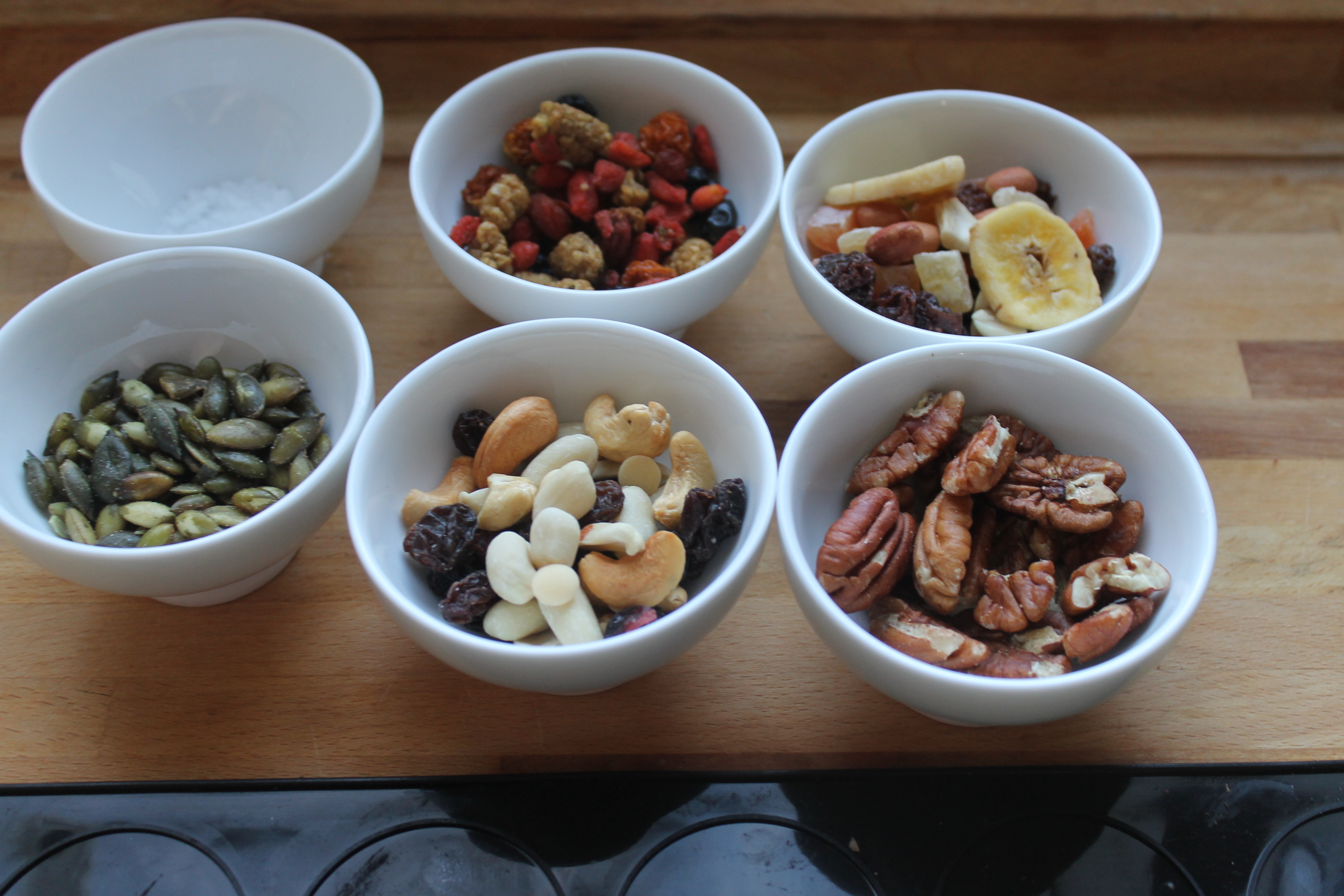 Ég byrjaði á að tína til nokkrar sortir af góðgæti til að setja ofan á. Þarna er Maldonsalt (ekki notað eitt sér þó), ristuð graskersfræ, ofurberjablanda, eitthvað sem heitir Cranberry Burst, Hawaii-blanda og pekanhnetur.