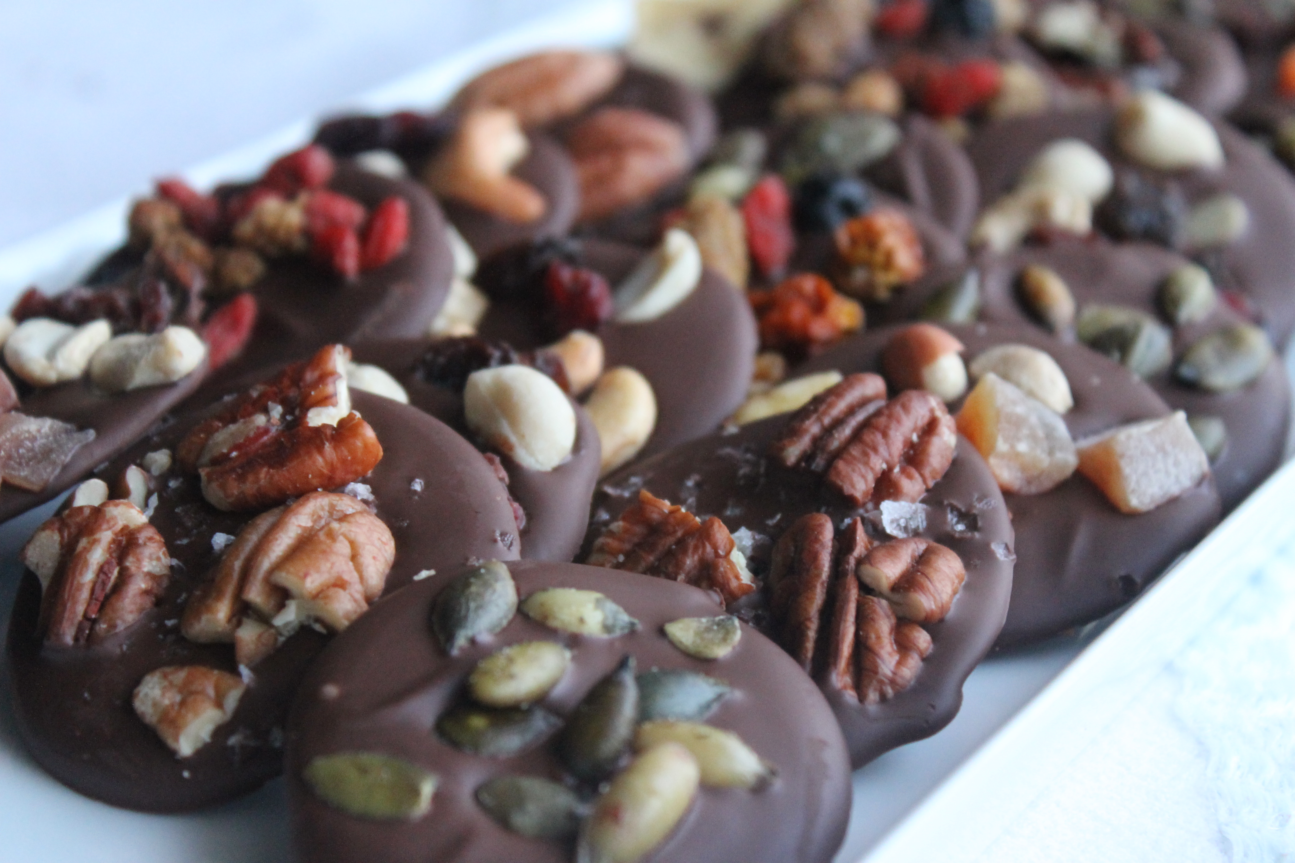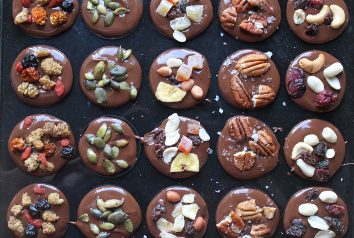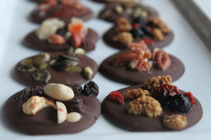 Eða það hlýtur að vera. Hnetur, fræ, þurrkaðir ávextir – engin chia-fræ reyndar, sem eru víst töframeðal allra töframeðala, en það eru goji-ber og allskonar ofurfæði í þessu. Það er alveg hreinasatt. Og súkkulaðið auðvitað, það er í fyrsta lagi ávöxtur (eða gert úr ávexti kakótrésins allavega) og svo eru alltaf að koma fram fleiri og fleiri vísbendingar um hollustu þess …
