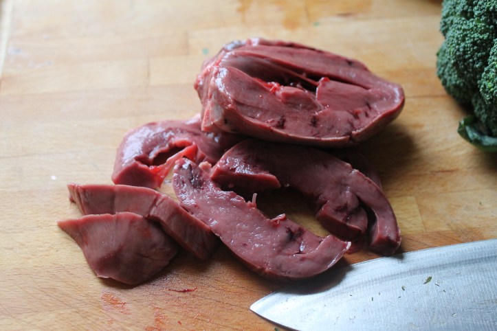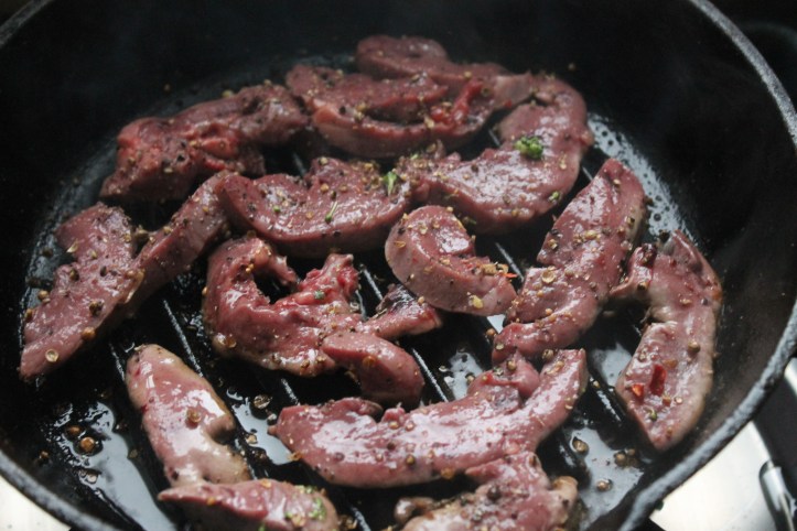Ég skar alla fitu af hjartanu (og ef það hefðu verið einhverjar æðar eða annað hefði ég tekið þær líka en það var nú ekki), skar það í tvennt og svo í þunnar sneiðar (1/2-1 cm) þvert yfir. Kryddaði sneiðarnar svo vel með pipar, nýmöluðu kóríanderfræi og salti.