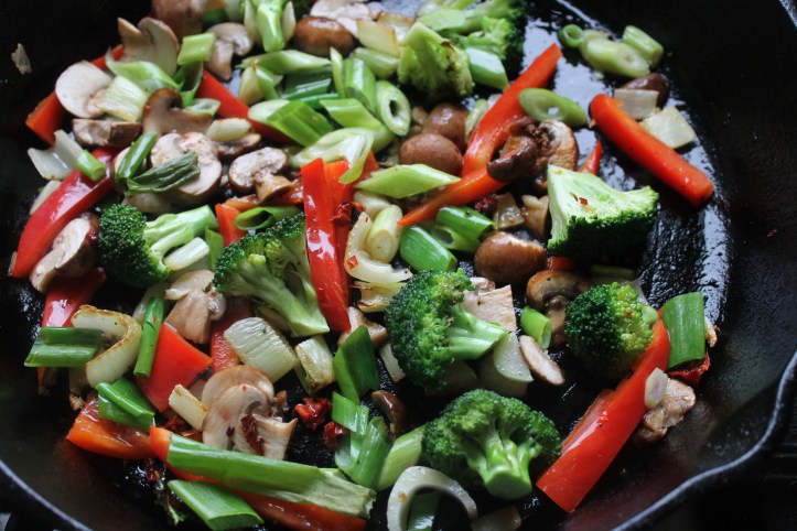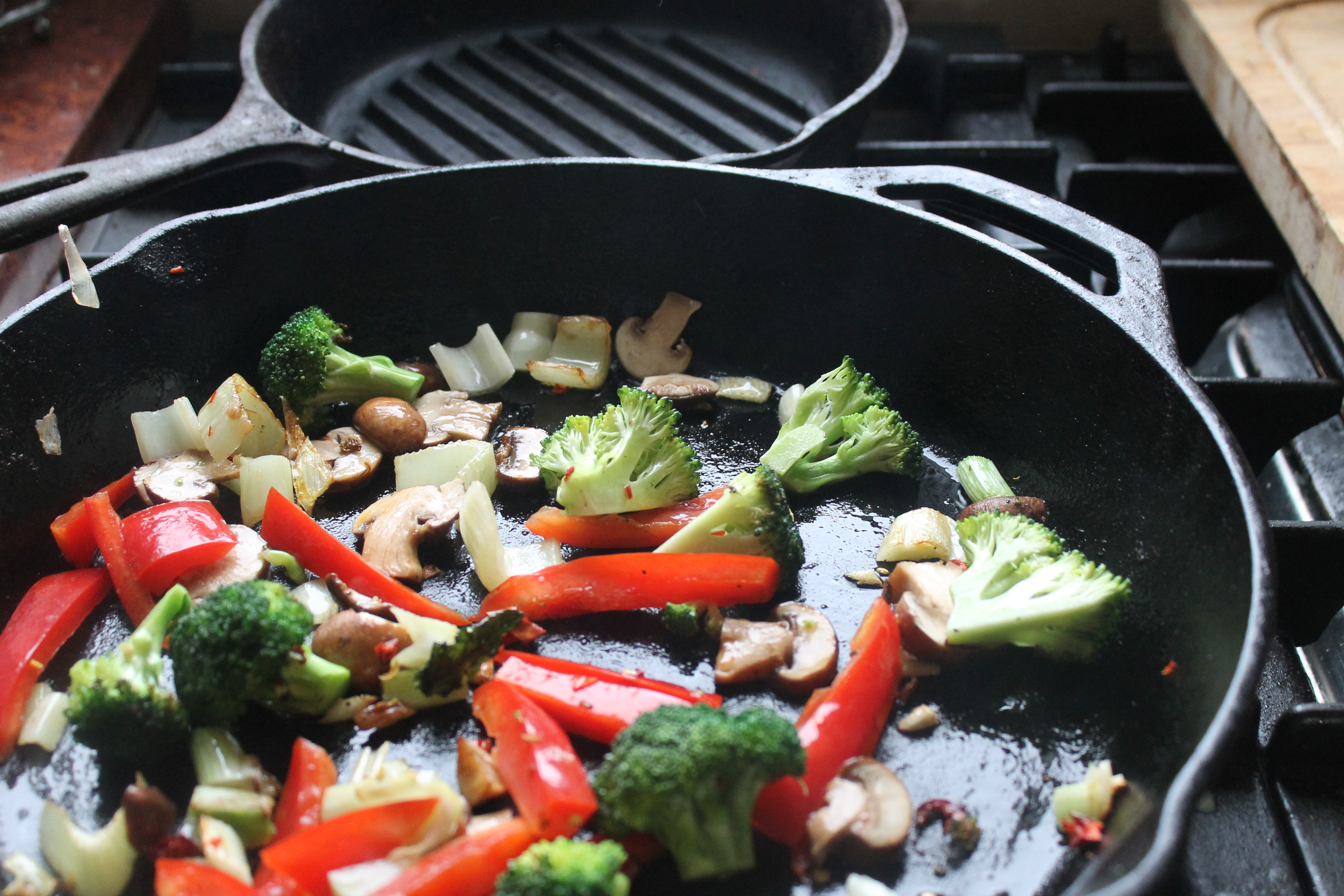 Ég byrjaði á að skera niður grænmetið. Það má nota alls konar fljóteldað (eða forsoðið) grænmeti í þetta en ég notaði það sem ég átti – skipti ögn af spergilkáli í litla kvisti, skar hálfa papriku í ræmur, 100 g af sveppum í sneiðar, smábita af fenniku í sneiðar, saxaði einn hvítlauk og hálft chili-aldin smátt; hitaði svo svona 2 msk af olíu á stærri pönnunni, setti grænmetið á hana og steikti við meðalhita í 3-4 mínútur; hrærði oft í því á meðan.