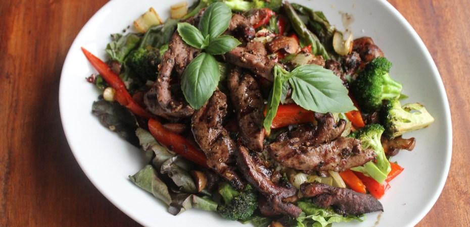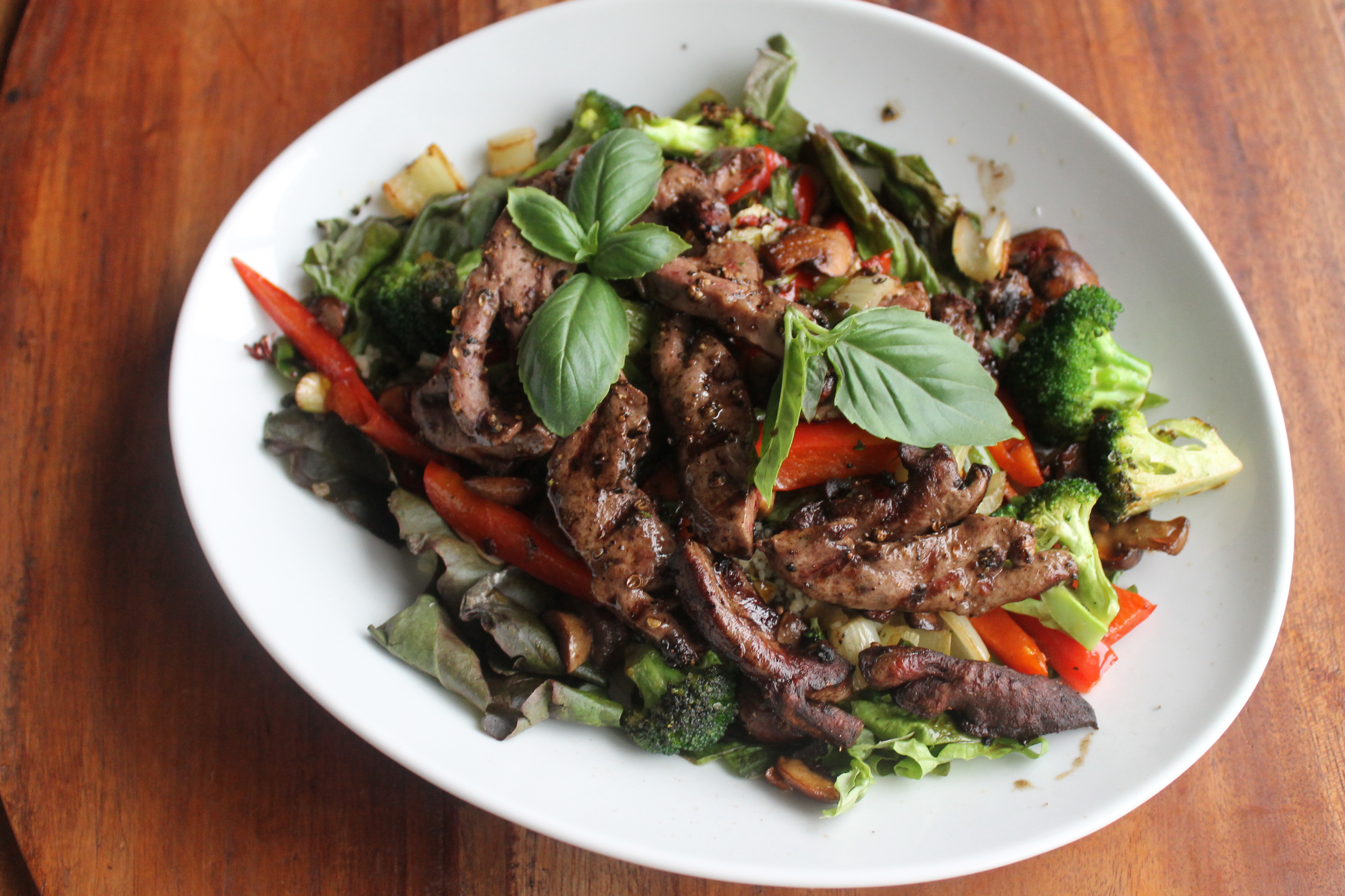 Ég setti kúskúsið á disk ásamt nokkrum rifnum salatblöðum, hellti grænmetinu af pönnunni yfir það og setti hjartasneiðarnar ofan á. Skreytti svo með basilíku (en það er nú óþarft).