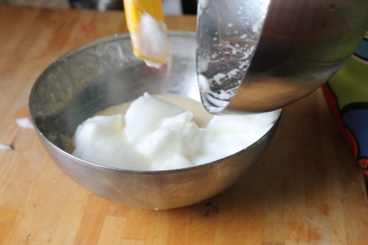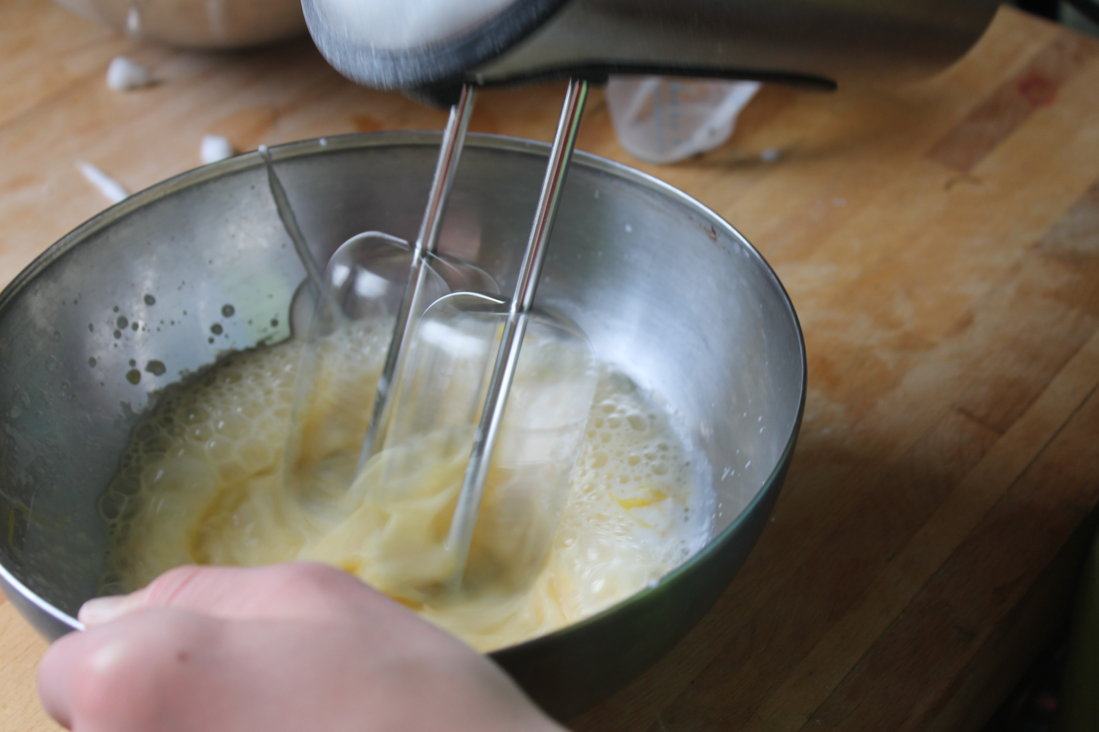 Ég braut tvö egg og aðskildi í tvær skálar og Úlfur þeytti hvíturnar þar til þær voru hálfstífar.