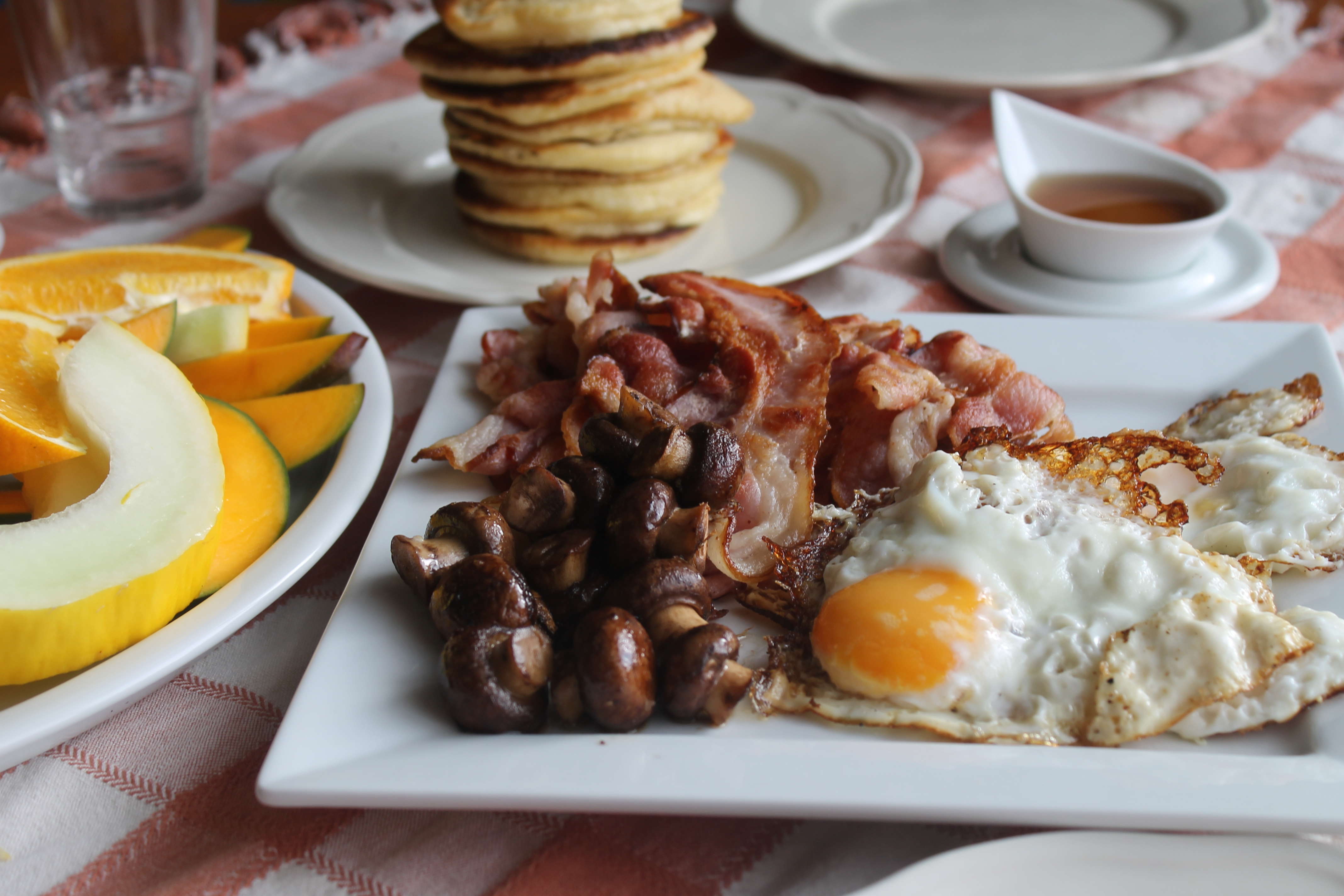 Svo að amman sá um að steikja pönnukökurnar, beikonið (það var sett á milli eldhúspappírsarka þegar það var tekið af pönnunni og farg sett ofan á til að pressa úr fitu), egg og kastaníusveppi (sem voru reyndar bara handa ömmunni), skera niður ávexti og bera á borðið.