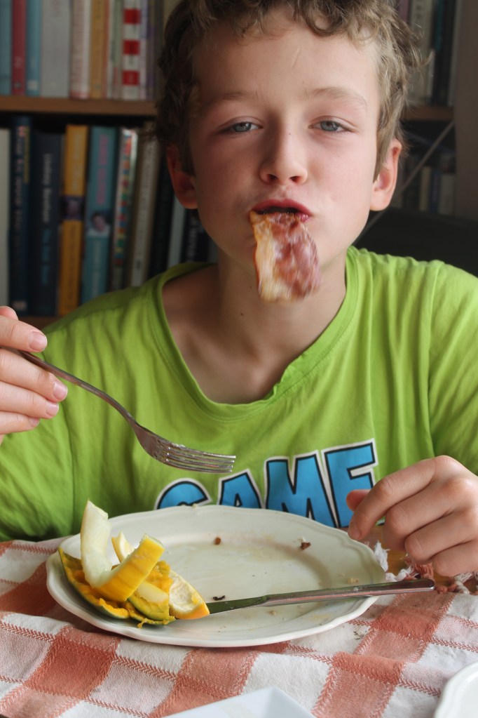 Drengurinn tók mjög rösklega til matar síns af beikoni, eggjum, pönnukökum og hlynsírópi – en eins og sjá má lét hann ávextina hreint ekki ósnerta heldur. En hann sagðist vera ,,næstum því saddur“ og afþakkaði meira að segja kökunsneið á eftir …