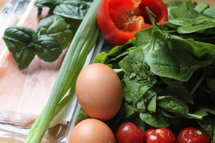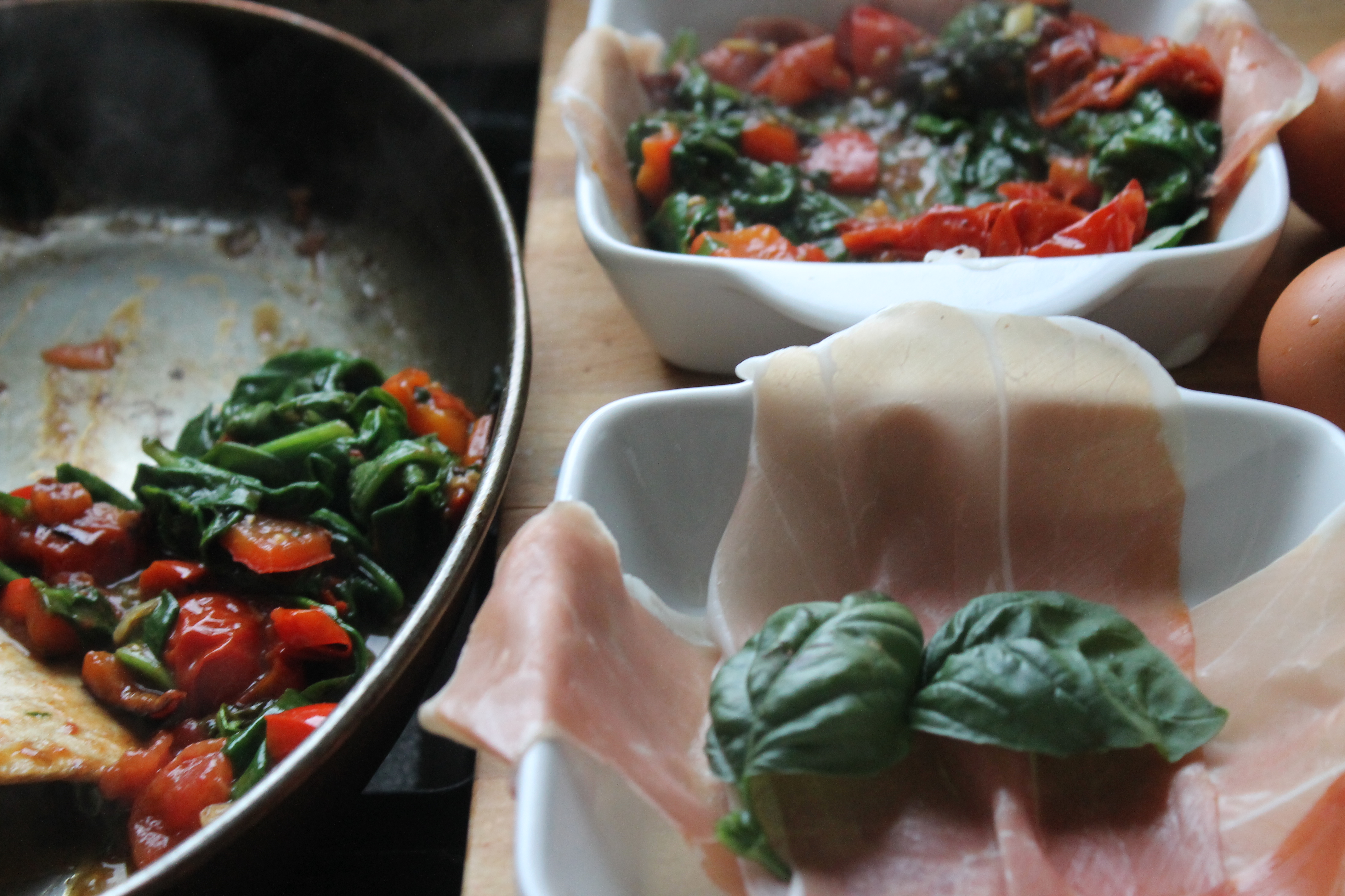 Ég hitaði ofninn í 200°C og tíndi svo til bréf af parmaskinku, tvö egg, einn vorlauk, nokkra aldraða og vel þroskaða kirsiberjatómata, tvær vænar lúkur af spínati, hálfa papriku, einn hvítlauksgeira og hálft chili-aldin. Já, og nokkur basilíkublöð. Skar paprikuna og vorlaukinn smátt og saxaði hvítlaukinn og chili-ið fínt.