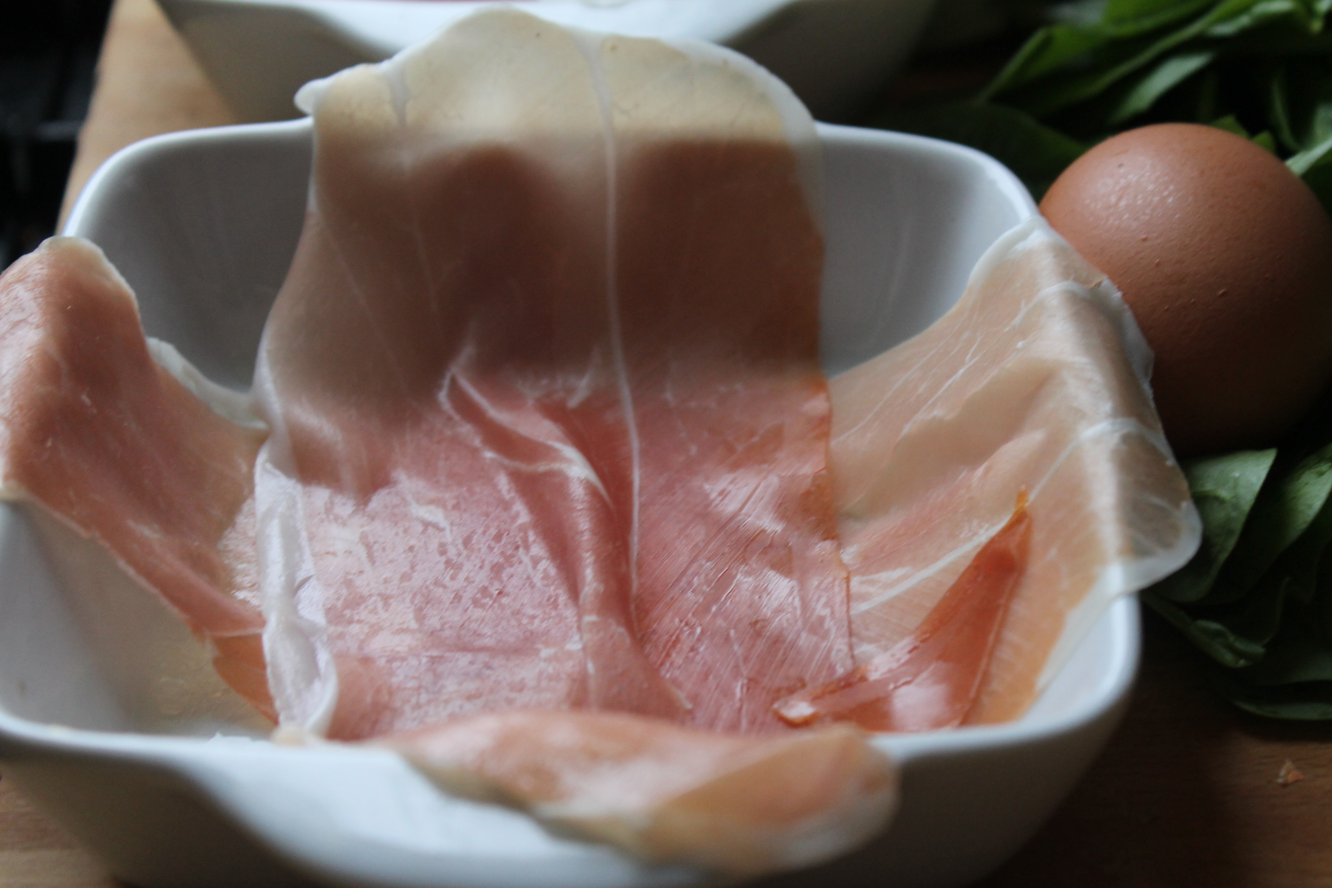 Ég setti 2-3 basilíkublöð í hvert form ofan á skinkuna og jós svo spínatblöndunni yfir.