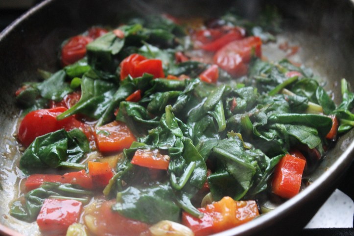Svo hitaði ég 1 msk af ólífuolíu á pönnu, setti hvítlaukinn, vorlaukinn, paprikuna og tómatana á hana, kryddaði með pipar, salti og dálitlu kummini og steikti við nokkuð góðan hita þar til tómatarnir voru sprungnir og hitt orðið meyrt. Hrærði oft á meðan.