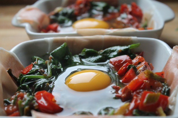 Ég var með spínat með rauðrófunum og kjötafganginum í gær og notaði spínat aftur í dag en í gjörólíkan rétt. Ég geri oft bökuð egg af þessu tagi en úr ýmiss konar hráefni og ýmist í litlum formum eða stærri; stundum líka á pönnu (en þá eru þau reyndar ekki bökuð, en þó gerð á sama hátt). Ég átti hráskinku, tómata og ýmislegt fleira og ákvað að gera bökuð egg með spínati og skinku.
