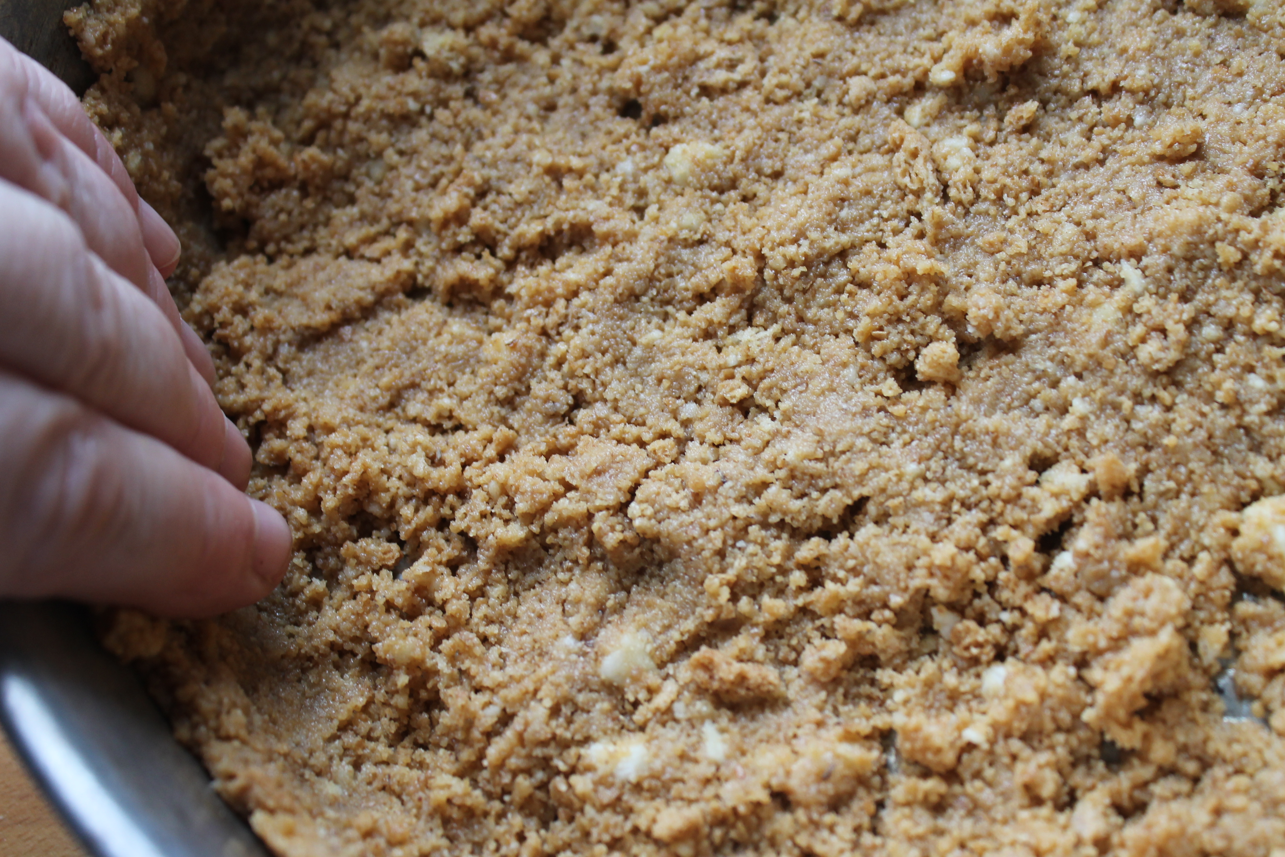 Ég þrýsti mylsnunni létt niður á botninn og svo upp með hliðunum með fingurgómunum. Þetta þarf ekkert að vera sérlega jafnt eða snyrtilegt sko …