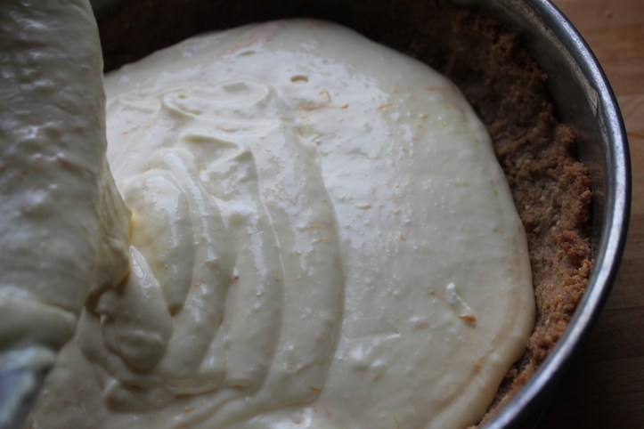 Svo hellti ég blöndunni yfir botninn í forminu, lækkaði ofnhitann í 165°C og bakaði kökuna neðarlega í ofni í um 45 mínútur. Bökunartíminn getur verið svolítið misjafn og það er vissara að fylgjast aðeins með kökunni þegar fer að líða á tímann.