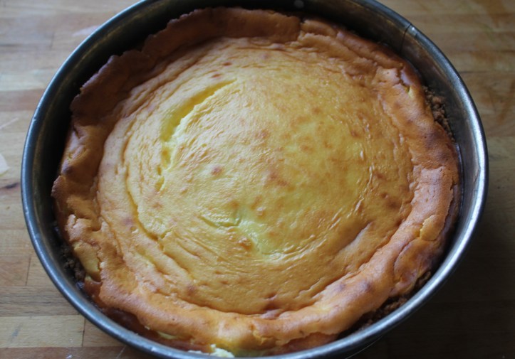 Kakan er tilbúin þegar hún hefur lyft sér vel og stífnað út við barmana en dúar enn svolítið í miðjunni (þó ekki fljótandi). Svo slökkti ég á ofninum og lét kökuna standa inni í honum í svona klukkutíma – hafði ofninn ekki alveg lokaðan.