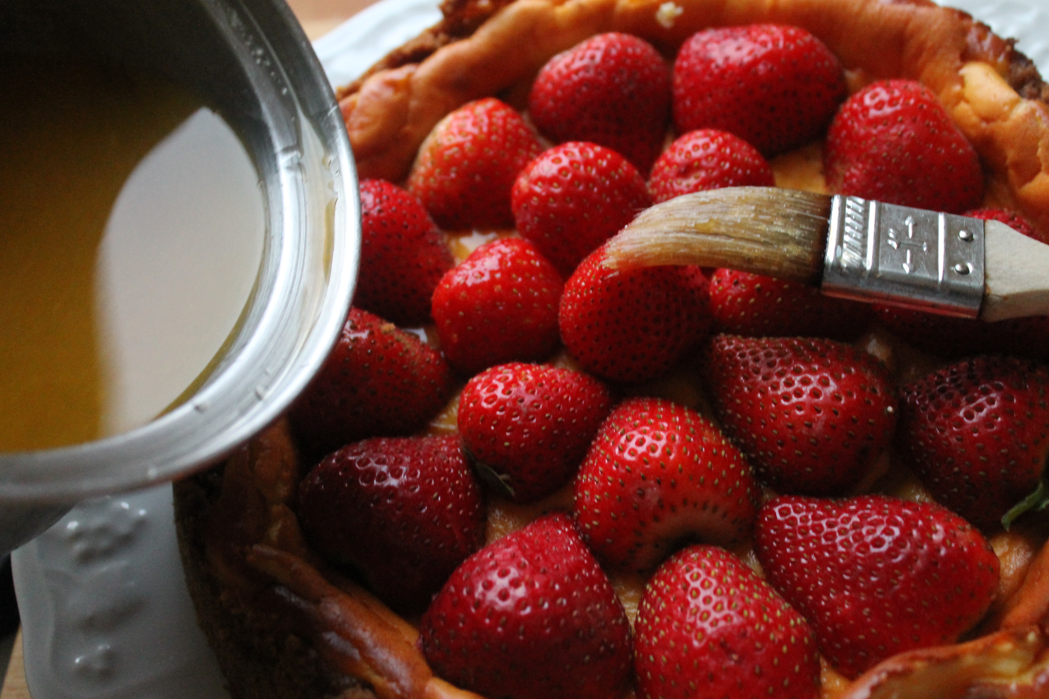 Ég kreisti safa úr 1 mandarínu (um 75 ml) og hitaði í potti með 1 msk af sykri. Svo setti ég 1 matarlímsblað sem ég hafði látið liggja í köldu vatni nokkrar mínútur út í og bræddi það í safanum. Lét þetta kólna dálítið. Svo skar ég um 300 g af jarðarberjum í tvennt og raðaði þeim ofan á. Svo penslaði ég berin og kantana á kökunni með safanum. Endurtók þetta svo tvisvar eða þrisvar til að fá góðan gljáa á berin.