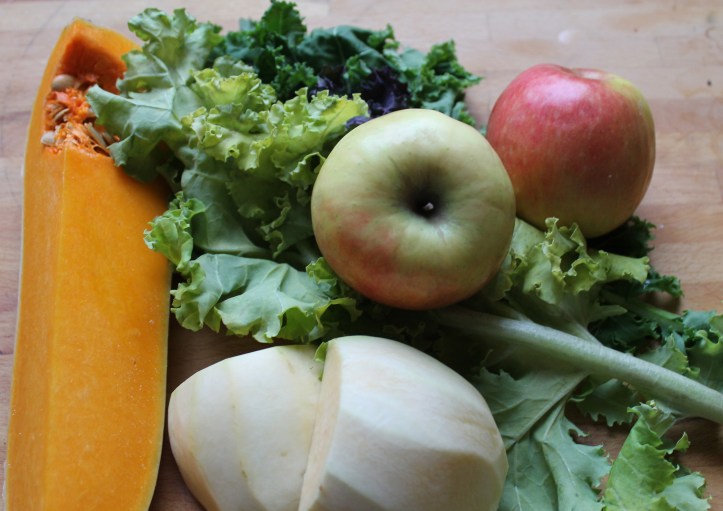 Eplin duga nú samt ekki alveg sem meðlæti. Ég átti eina litla rófu en fannst hún ekki duga (og svo var hún ekki nægilega litrík heldur, gulrófur eiga að vera gular en ekki gulhvítar) svo að ég tók fjórðung af butternut-kúrbít sem ég átti og svo voru til nokkur blöð af grænkáli. Og tvö Pink Lady-epli. Það má auðvitað nota önnur epli en Red Delicious eru of mjölkennd og bragðlítil til steikingar og Granny Smith of þétt og súr, svo ég nefni tvær algengar tegundir.