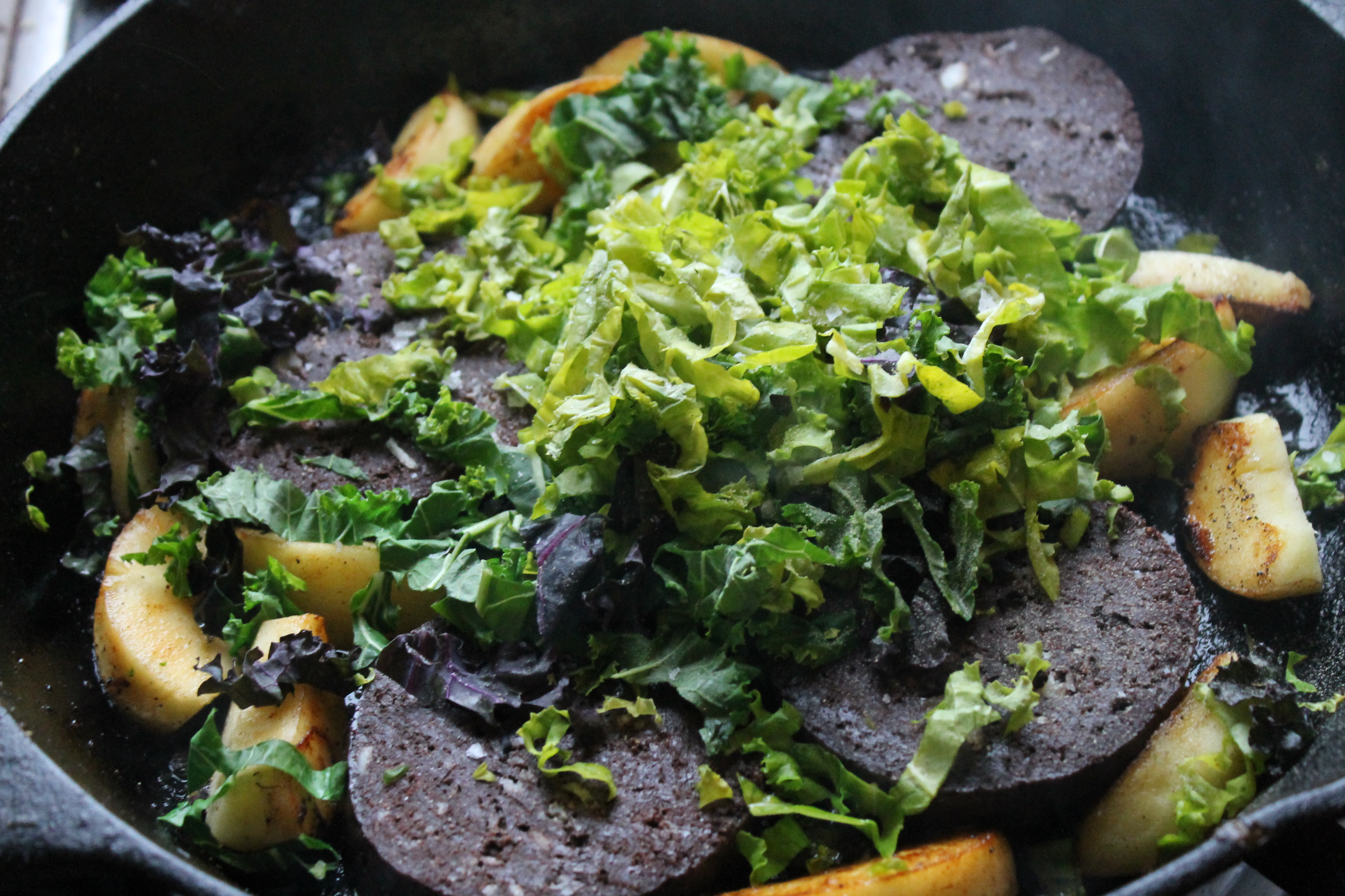 Á meðan grænmetið sauð flysjaði ég eplin, kjarnhreinsaði þau og skar þau í báta. Skar stönglana úr grænkálsblöðunum (notaði þá ekki) og saxaði kálið smátt. Svo bræddi ég svolítið smjör á pönnu, skar blóðmörinn í svona 1 1/2 þykkar sneiðar (tók vömbina utan af) og setti þær á pönnuna og setti eplabátana á milli. Steikti þetta í 2-3 mínútur við meðalhita en sneri þá blóðmörssneiðunum og eplunum …