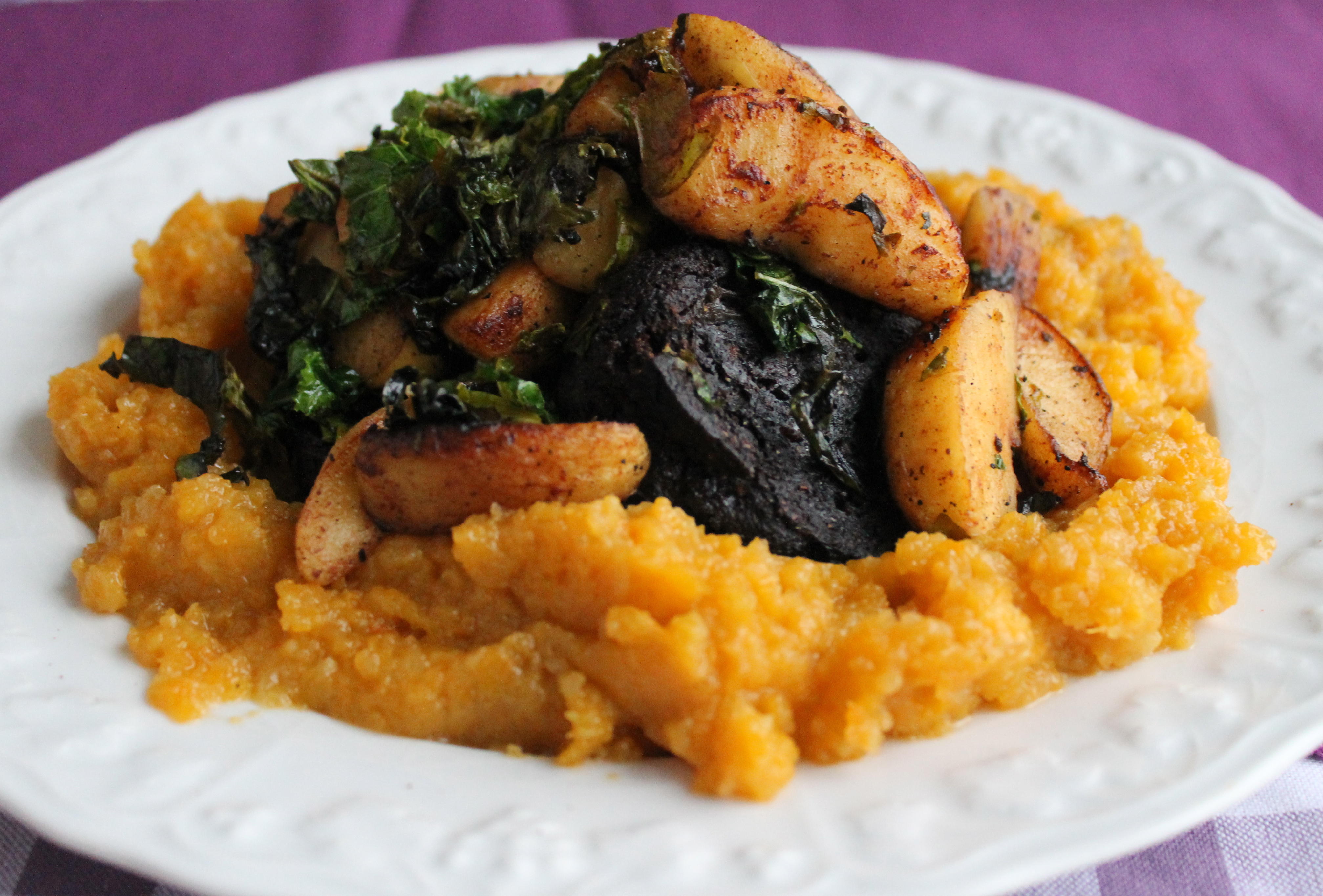 Ég dreifði stöppunni í hring á fat og setti blóðmörinn, eplin og grænkálið í miðjuna.
