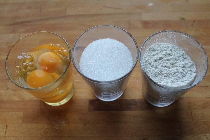 En allavega, maður tekur þrjú jafnstór glös, brýtur þrjú egg í eitt, hellir sykri í annað svo hann nái jafnhátt og eggin og í það þriðja setur maður tvær matskeiðar af kartöflumjöli, lyftiduft eftir smekk (eða sleppir því eins og ég geri) og fyllir svo upp með hveiti, jafnhátt og eggin og sykurinn. – Það er reyndar hægt að nota bara hveiti. En ástæðan fyrir kartöflumjölinu er þessi: Í þessa botna og annað svipað bakkelsi er best að nota kökuhveiti, sem er próteinminna en venjulegt hveiti. Það fæst hins vegar ekki hér og þess vegna er gott að lækka próteinhlutfallið með því að blanda kartöflumjöli saman við. Eins má nota maíssterkju (maizenamjöl).