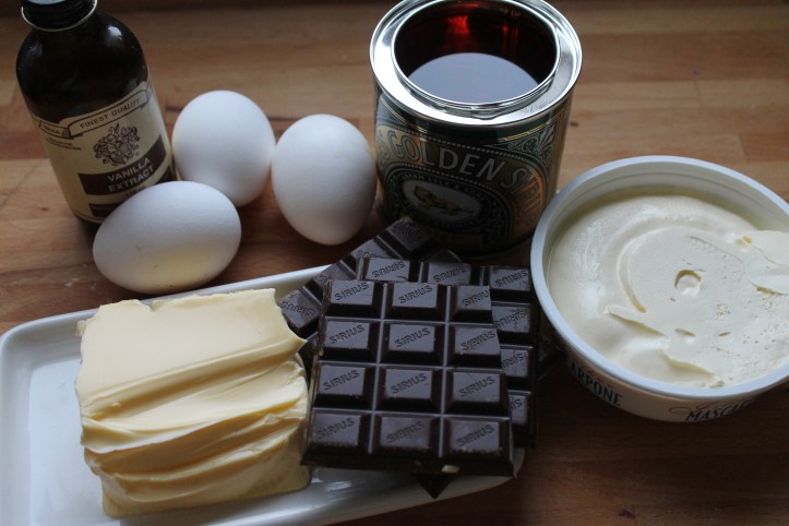 Ég byrjaði á að bræða súkkulaðið í vatnsbaði og tók það svo af hitanum og lét kólna aðeins. Á meðan setti ég smjör, mascarpone-ost, síróp og vanillu í hrærivélarskálina og þeytti vel saman.