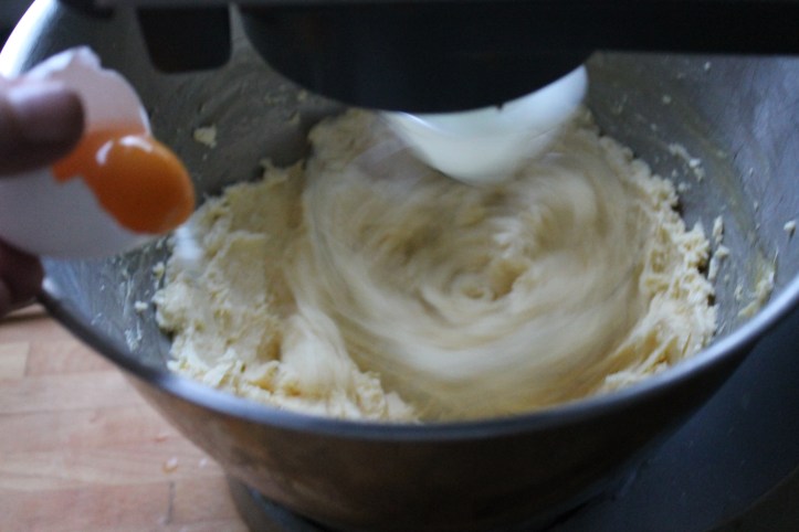 Svo þeytti ég eggjarauðunum saman við, einni í einu, og skóf vel niður hliðarnar á skálinni á milli.