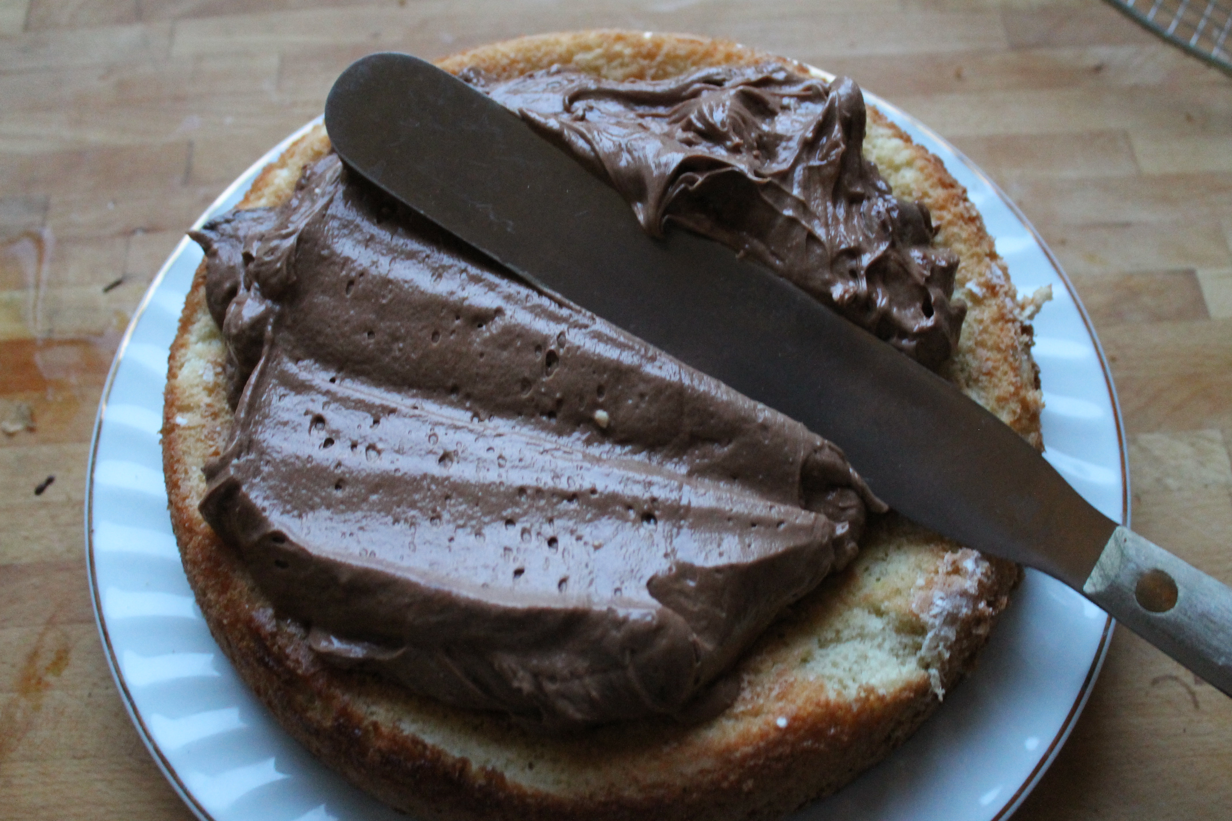 Þegar botninn var orðinn kaldur smurði ég kreminu á hann með spaða, bæði ofan á og utan á hliðarnar. Þarna má alveg láta staðar numið, eða þá skreyta kökuna til dæmis með söxuðu súkkulaði, hnetum eða öðru slíku, sælgætismolum, skrautsykri eða bara hverju sem manni dettur í hug og passar við súkkulaði (og það er nú ekki fátt sem passar við súkkulaði, ef út í það fer).
