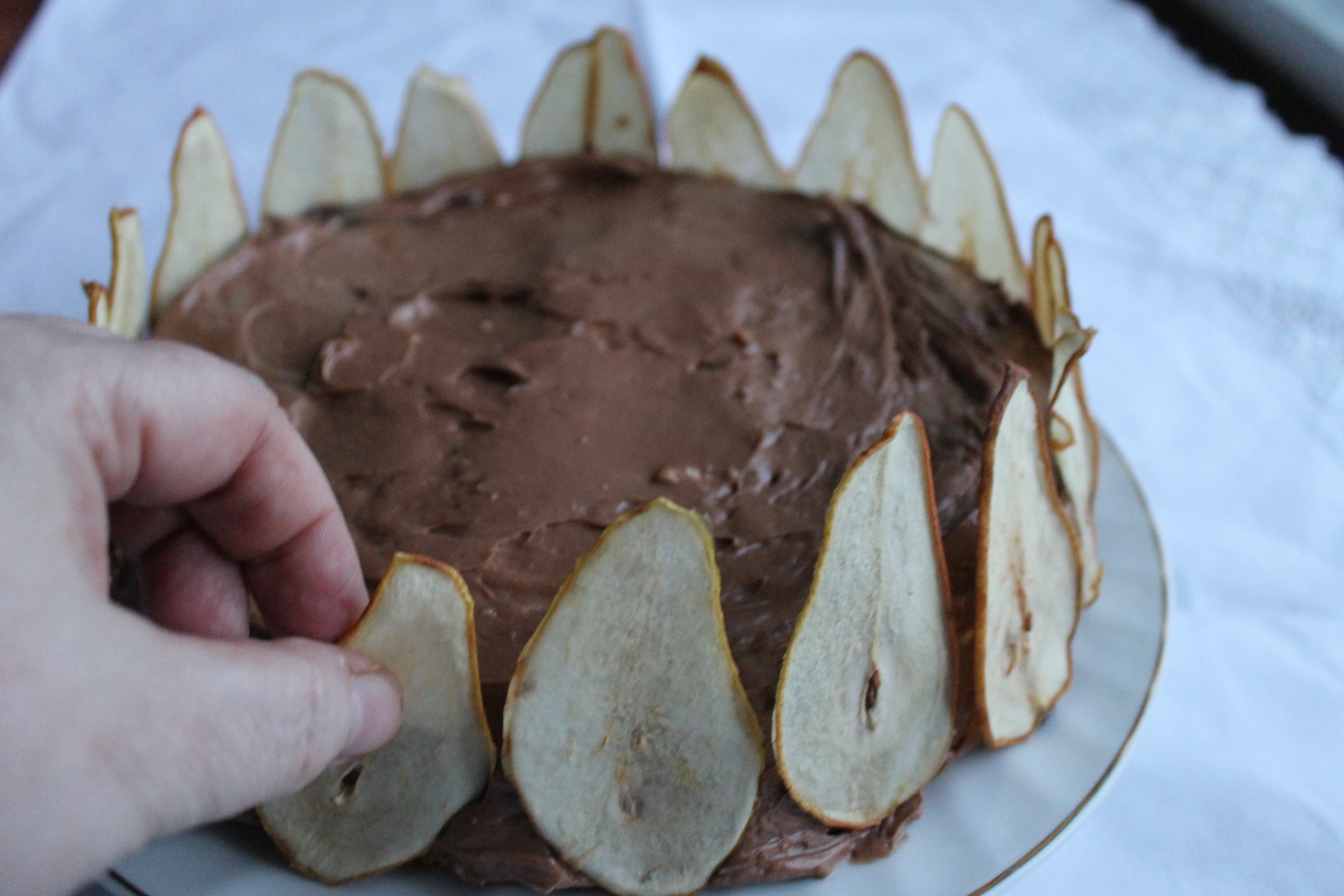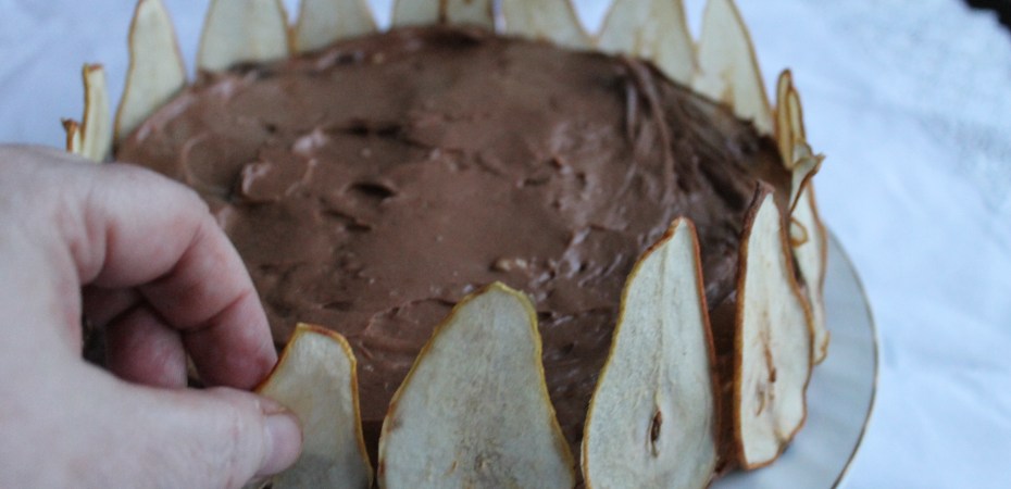 Þegar ég var búin að þurrka perurnar á sunnudaginn datt mér í hug að það gæti verið gaman að nota þær í kökuskreytingu. Eiginlega var ég með allt öðruvísi köku í huga og það er vel líklegt að ég geri hana seinna. En ég var búin að ákveða að gera köku í dag og svo kom ég seint heim og hafði lítinn tíma svo það varð úr að ég stytti mér leið, bakaði einfaldan svampkökubotn og setti súkkulaði-mascarponekrem á hann og svo perurnar.