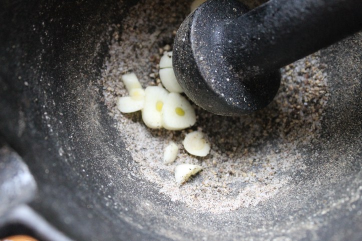 Svo setti ég svört piparkorn og Maldon-salt í mortél og steytti og bætti svo við einum hvítlauksgeira, niðurskornum, og maukaði hann saman við. Setti 2 tsk af ólífuolíu og 1/2 tsk af herbes de provence (mætti líka vera t.d. ítölsk kryddjurtablanda eða bara timjan eða óreganó) út í og gerði úr þessu dökkt mauk.