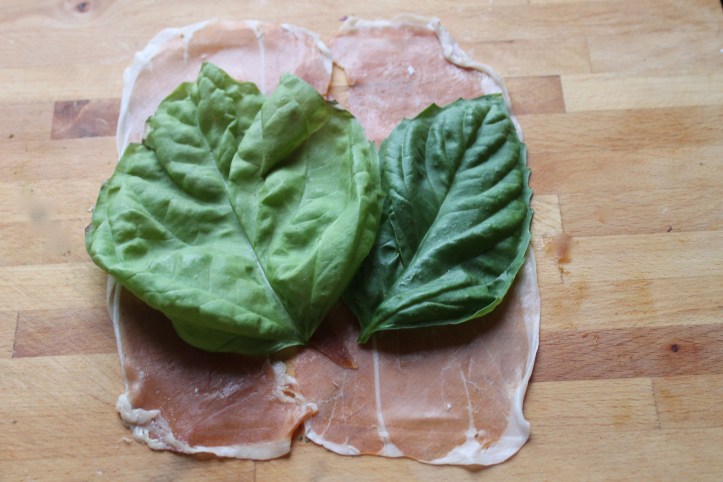 Ég átti tvær sneiðar af ítalskri hráskinku og setti þær á borðið og lét þær skarast örlítið. Þær hefðu eiginlega þurft að vera þrjár en ég átti semsagt bara tvær svo þær urðu að duga … Ofan á þær setti ég tvö af basilíkublöðunum. Ef ég hefði verið með venjulega basilíku hefði ég bara dreift nokkrum blöðum yfir miðjar sneiðarnar.