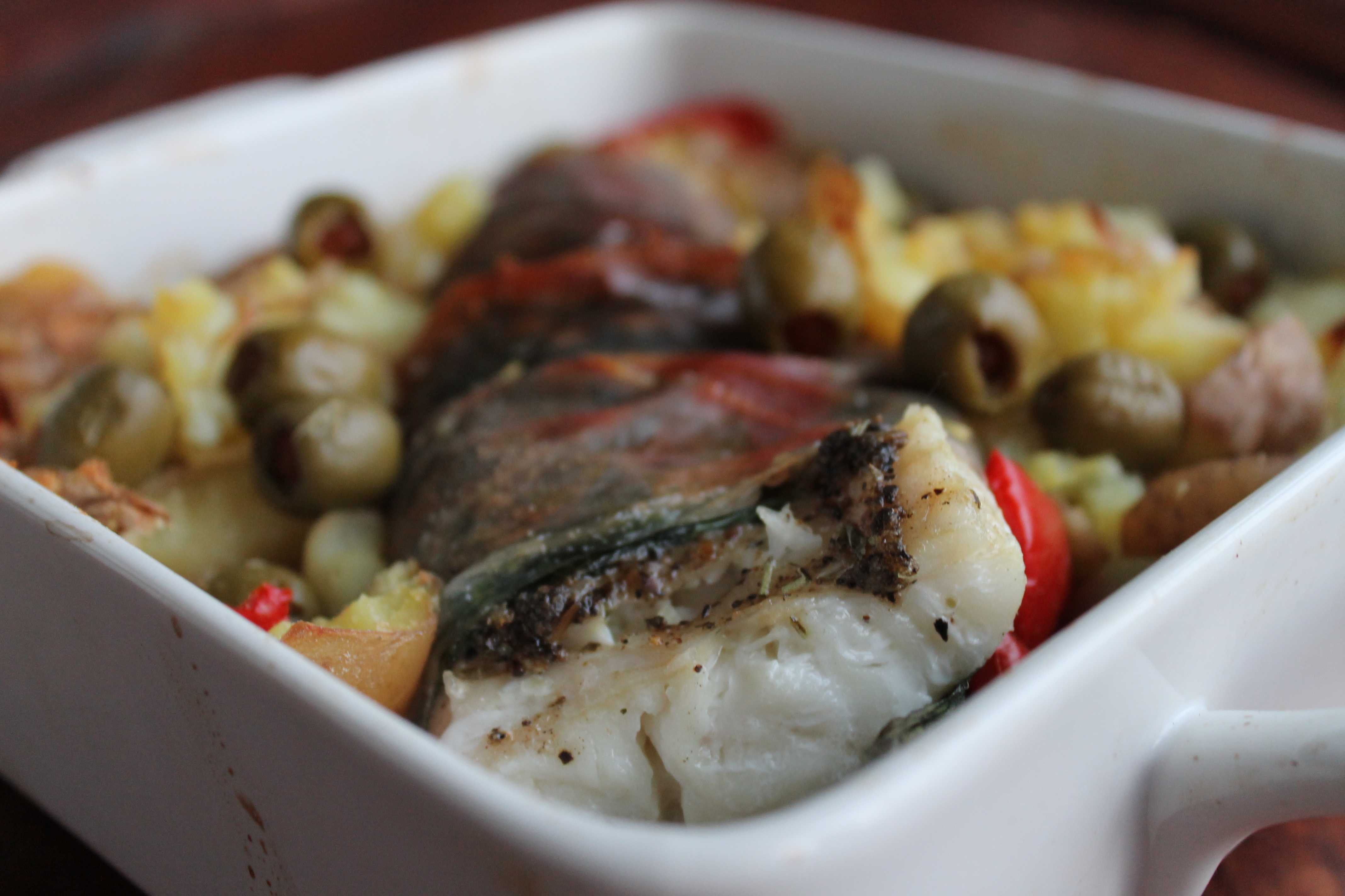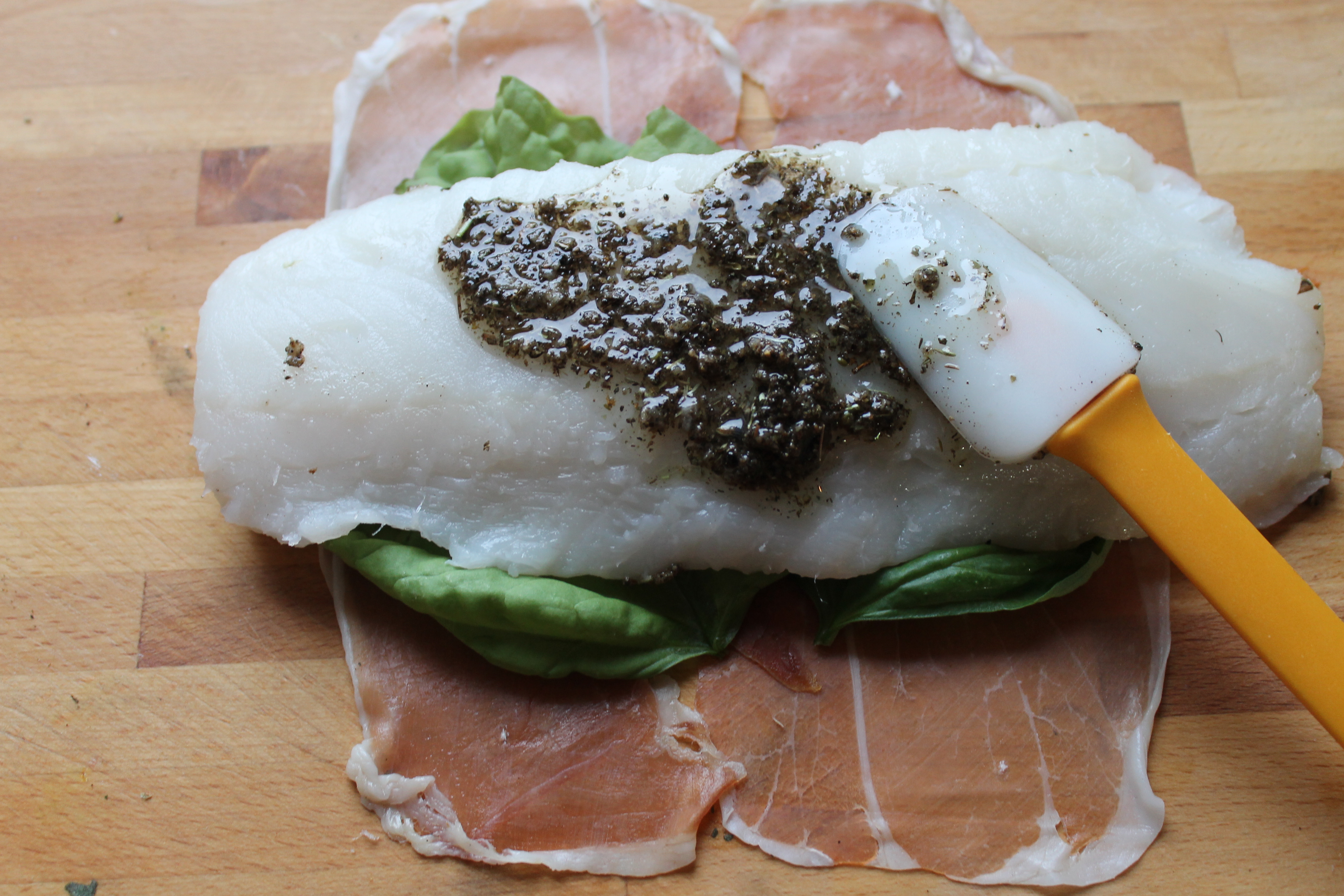 Svo smurði ég helmingnum af kryddmaukinu á aðra hliðina á fiskinum, lagði hann á basilíkublöðin með krydduðu hliðina niður og smurði afganginum af maukinu á hina hliðina, lagði hin basilíkublöðin ofan á (þau huldu fiskinn alveg svo sást hvergi í hann, vafði skinkunni utan um og lagði vefjuna í lítið, eldfast mót sem ég var búin að smyrja með ögn af ólífuolíu.