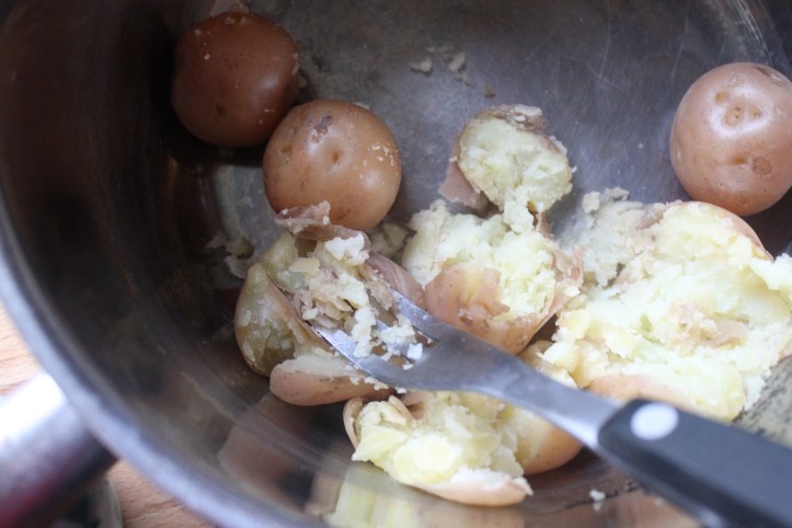 En ég byrjaði allavega á að stilla ofninn á 200°C og setja nokkrar litlar kartöflur í pott og sjóða því ég ætlaði að hafa kramdar kartöflur í réttinum.