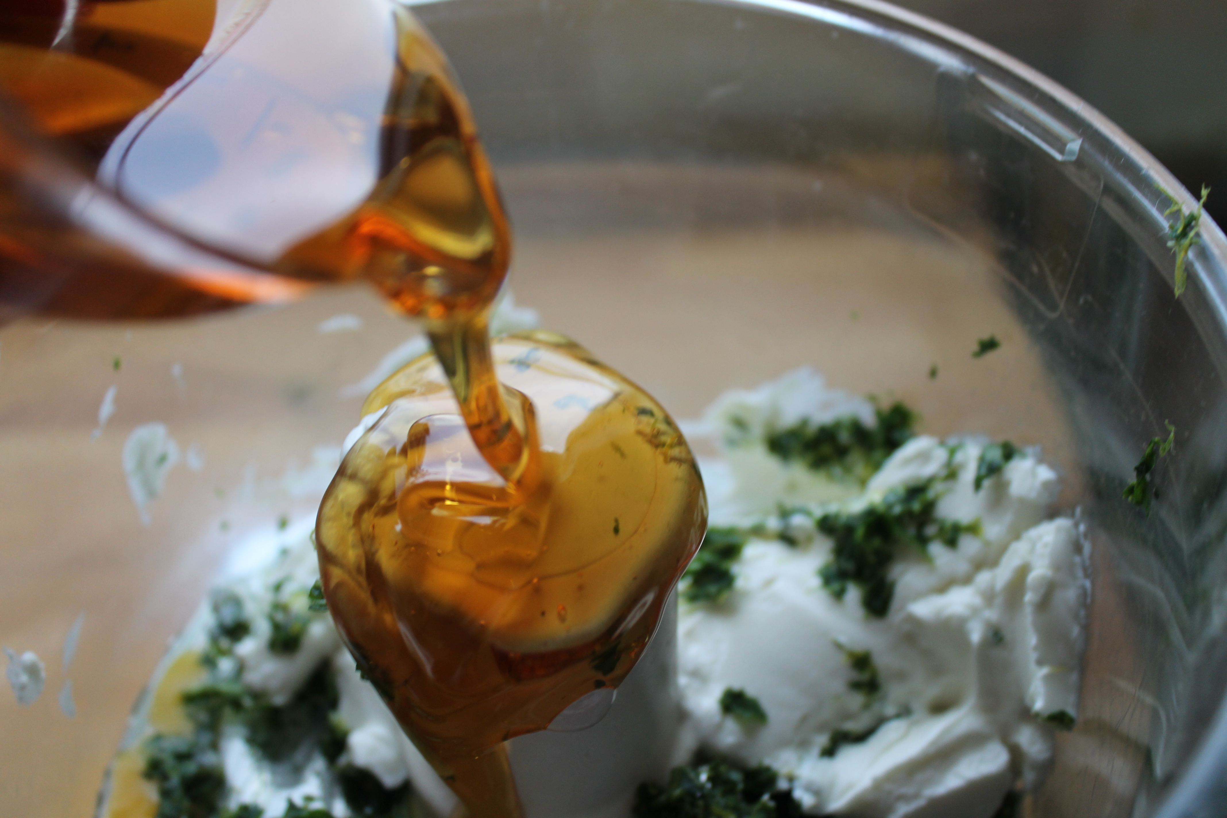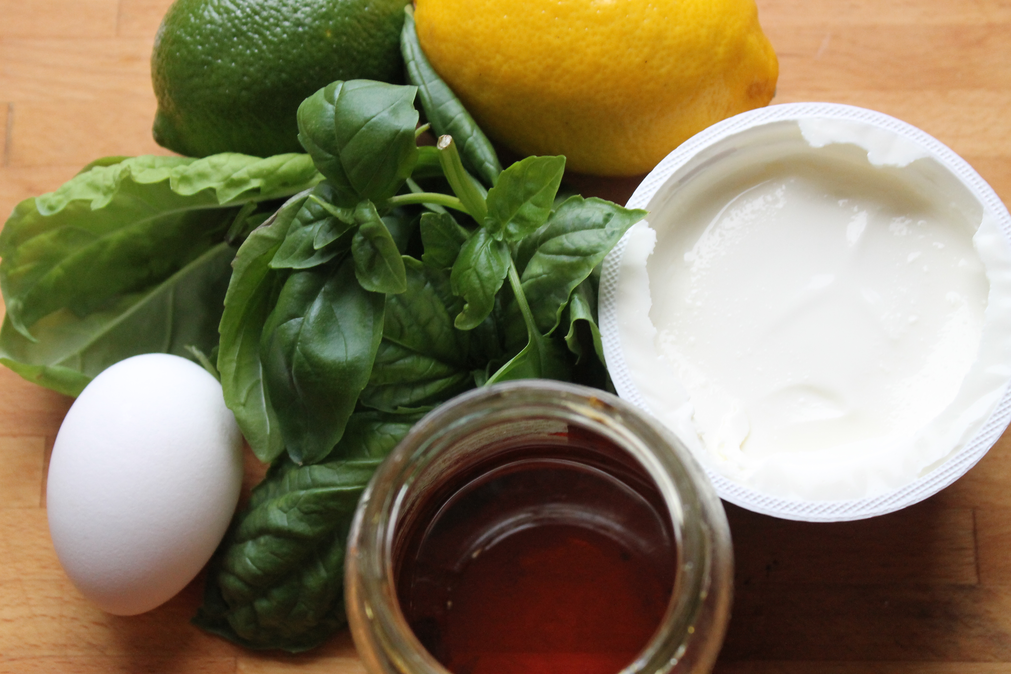 Ég notaði 200 g af hreinu KEA-skyri, 1 egg, 100 ml af akasíuhunangi, 1/2 sítrónu, 1/2 límónu (bara börkinn af báðum), vænt knippi af basilíku (þetta er blanda af þremur tegundum; líklega álíka mikið og er í 1 bakka af basilíku úr búð). Og 125 ml af rjóma, sem ekki er á myndinni.
