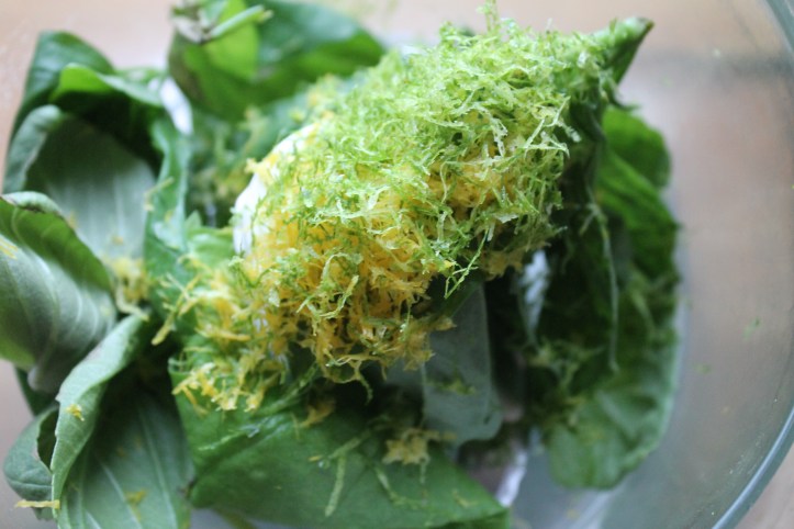 Ég setti basilíkuna í matvinnsluvélina og fínreif börk af 1/2 sítrónu og 1/2 límónu yfir. Lét svo vélina ganga þar til basilíkan var fínsöxuð.