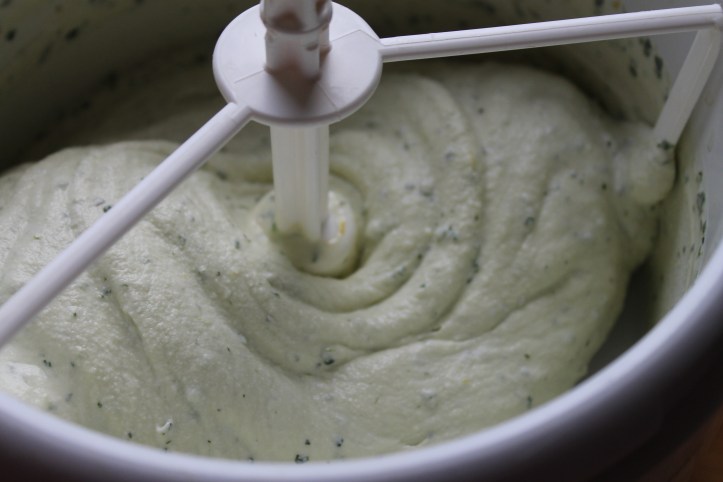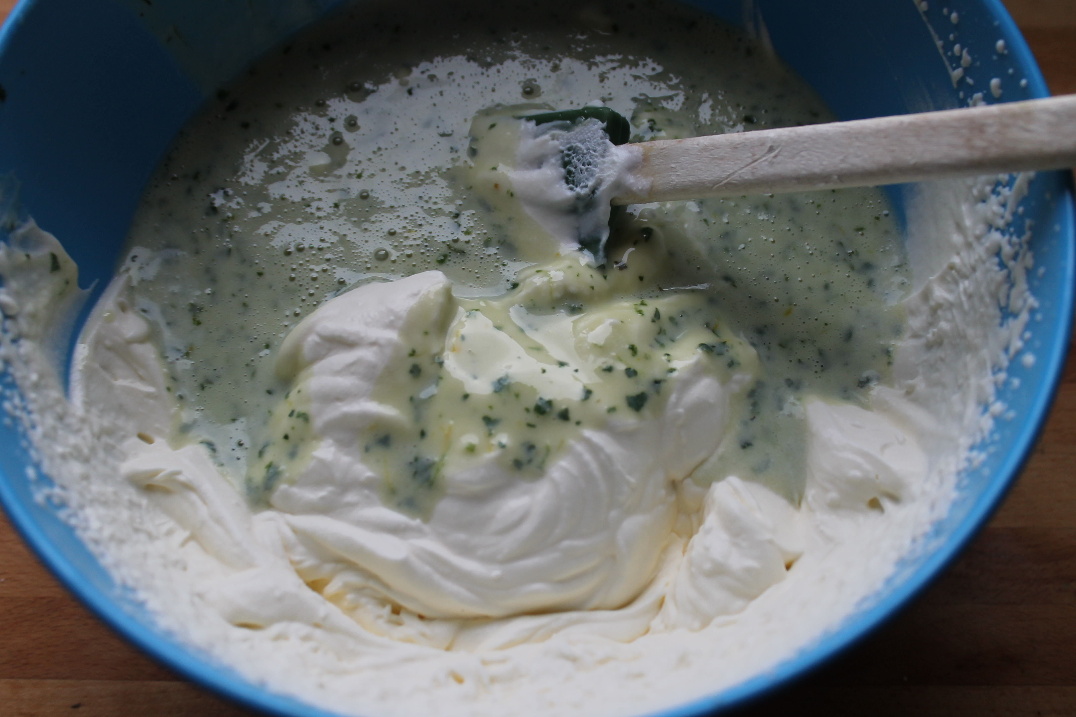 Svo stífþeytti ég rjómann í skál, hellti basilíkuskyrblöndunni yfir og blandaði lauslega saman – þetta blandast hvort eð er saman í ísvélinni – en ef ekki er notuð ísvél þarf auðvitað að hræra þetta nokkuð vel saman.