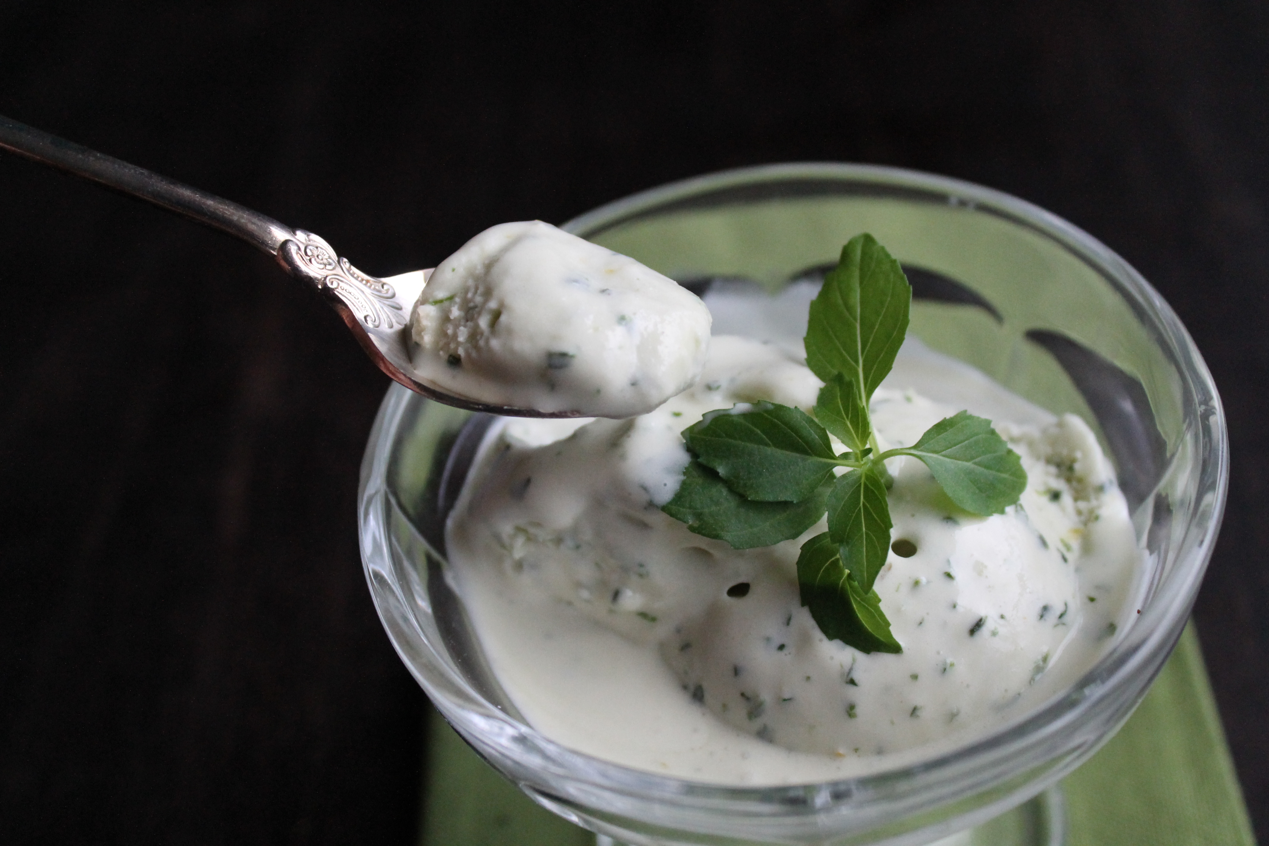 Ég setti ískúlu í skál og skreytti með basilíku.
