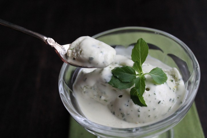 Mig langaði í ís í dag. Ekki súkkulaðiís eða vanilluís eða einhvern feitan rjómaís – eins og þeir geta nú verið góðir – heldur einhvern frísklegan og kannski dálítið óvenjulegan ís. Eins og komið hefur fram á ég hálfan annan helling af basilíku svo að ég ákvað að gera basilíku-hunangs-skyrís. Ég hef gert basilíkuís áður og líka hunangs-skyrís, en mér datt allt í einu í hug að þetta gæti nú passað nokkuð vel saman.