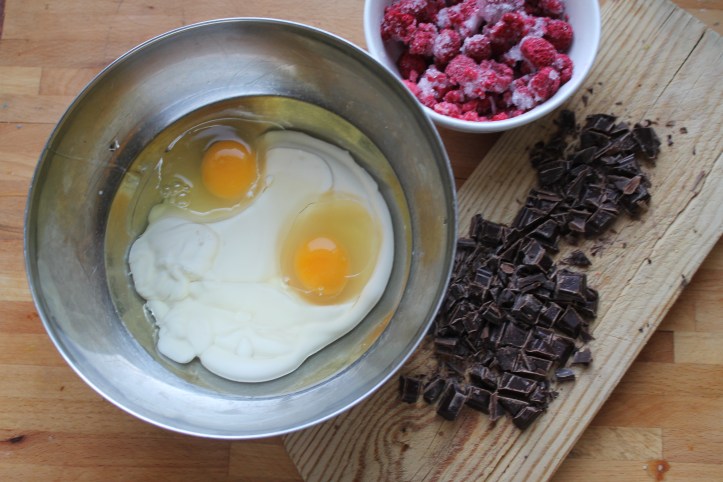 Ég hitaði ofninn í 190°C. Tók 150 g af hindberjum úr frysti (þau mega fara nærri alveg frosin í deigið) og grófbrytjaði 60 g af suðusúkkulaði. Svo setti ég 100 ml af matarolíu, 200 ml af AB-mjólk (má vera súrmjólk eða hrein jógúrt) og 2 egg í skál og blandaði saman.