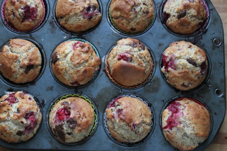 Í annarri skál blandaði ég saman 300 g af hveiti, 2 tsk af lyftidufti, 1/2 tsk af matarsóda og 1/4 tsk af salti og setti svo hindberin og súkkulaðið út í og blandaði. Ef hindberjunum er velt upp úr hveitinu eru minni líkur á að þau sígi til botns í deiginu. – Svo hellti ég blautefnunum yfir og blandaði með sleikju, bara rétt nægilega til að hvergi sæjust hveitiblettir.