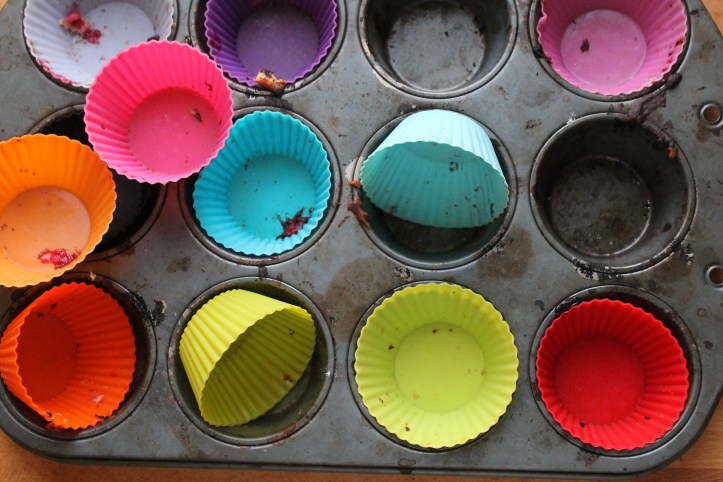 Losaði þær úr formunum á meðan þær voru enn heitar – mér finnst oft betra að gera það þegar eru t.d. ber eða súkkulaði í múffunum (og hér var hvorttveggja), því slíkt vill stundum aðeins festast við silíkonið þegar það kólnar. Þótt það eigi að vera viðloðunarfrítt – og sé það, svona nokkurn veginn.