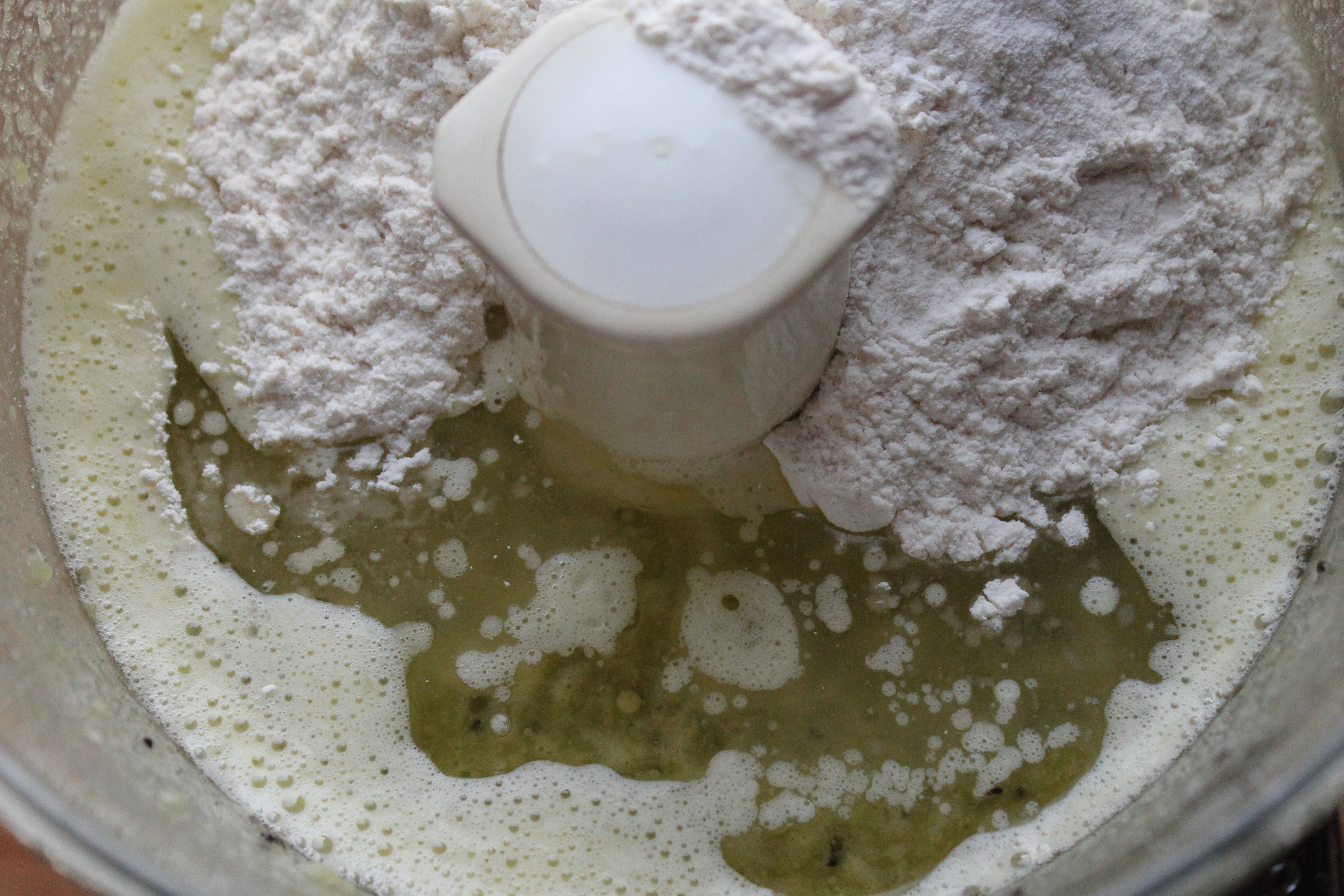 Svo setti ég 125 ml af olíu, 200 g af hveiti, 100 g af heilhveiti (sjá þó hér á eftir), 2 tsk af lyftidufti og 1/4 tsk af salti út í og blandaði saman við (notaði púlshnappinn á matvinnsluvélinni, bara rétt til að blanda öllu saman, en annars má bara hræra þetta með sleikju eða sleif).