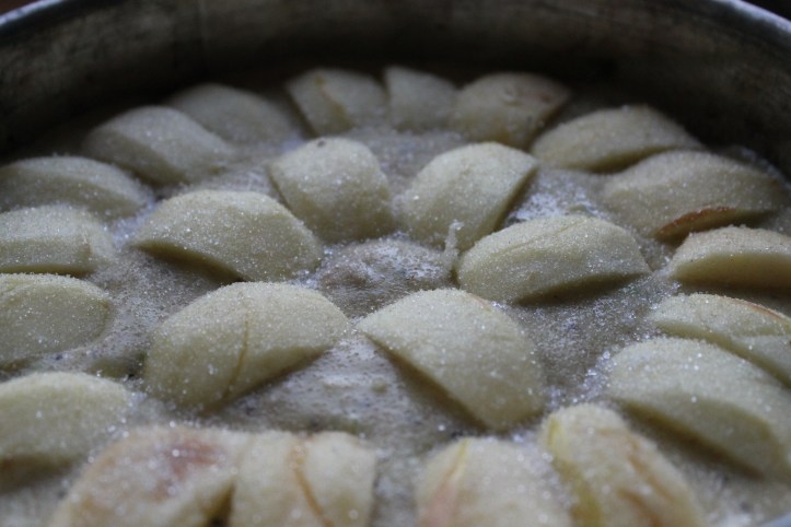 Svo raðaði ég eplabátunum ofan á deigið og stráði síðan 1-2 msk af sykri yfir. Sykrinum má alveg sleppa en kakan verður fallegri ef hann er notaður.