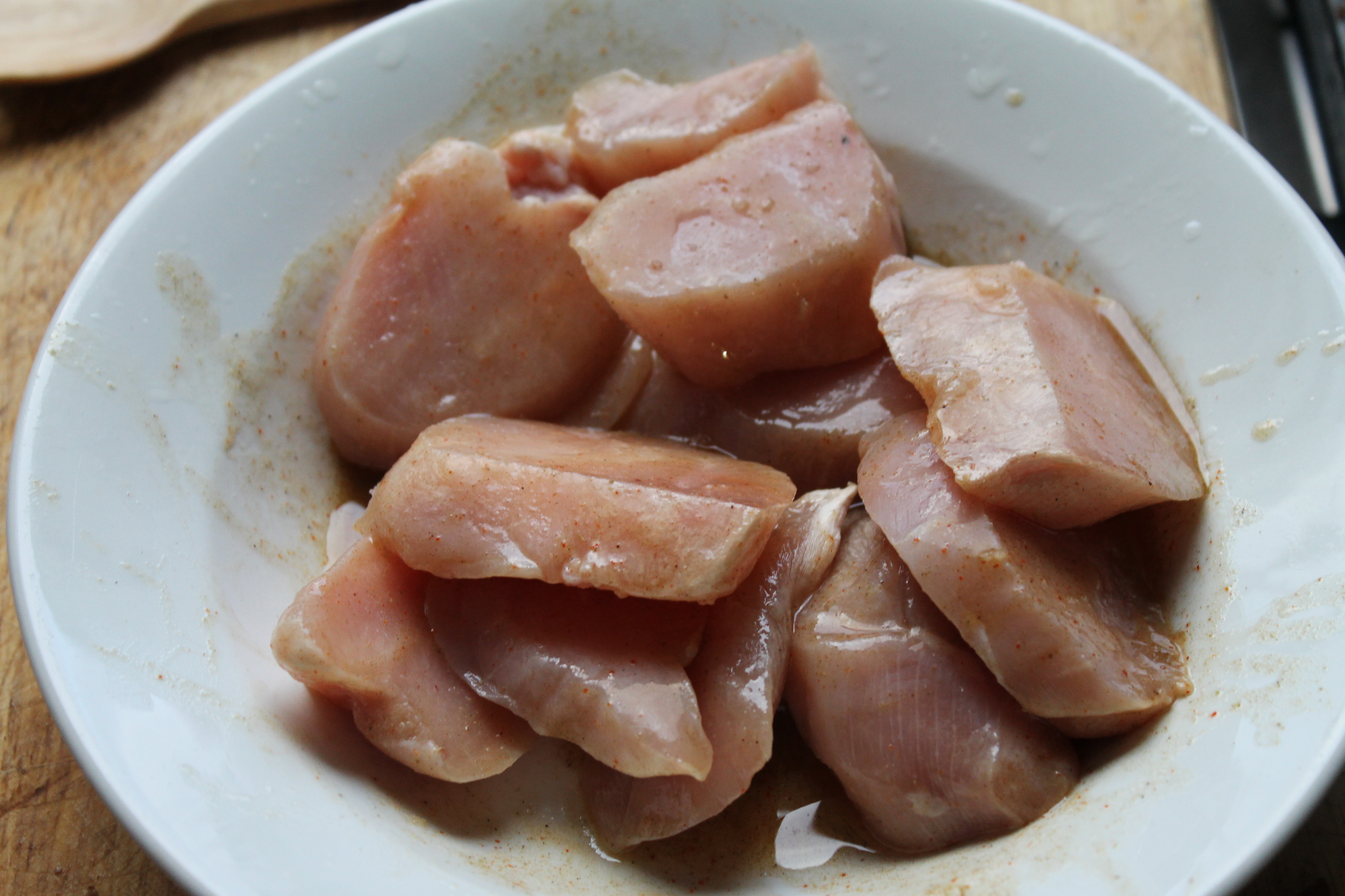 Ég blandaði saman á djúpum diski svona 1 msk af olíu (þetta var jarðhnetuolía en það má nota ólífuolíu eða aðra olíu), 2 tsk af sítrónusafa,1/2 tsk af timjani (sem er reyndar líklega ekki komið í maríneringuna þegar myndin er tekin) 1/2 tsk af kummini, örlitlum cayenne-pipar, pipar og salti, velti kjúklingasneiðunum upp úr og lét þær liggja á meðan þær voru að þiðna; hrærði í nokkrum sinnum til að velta þeim upp úr maríneringunni.