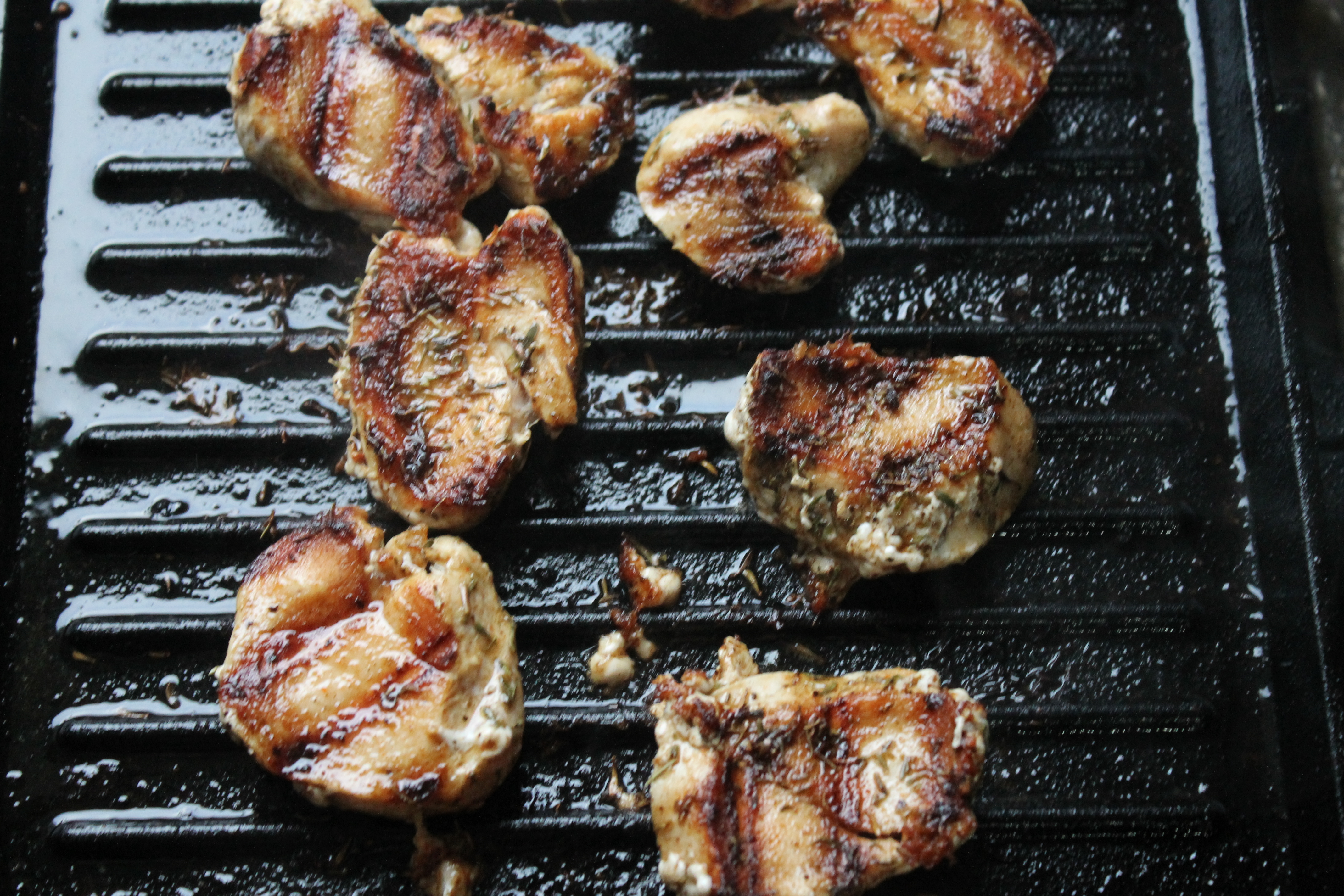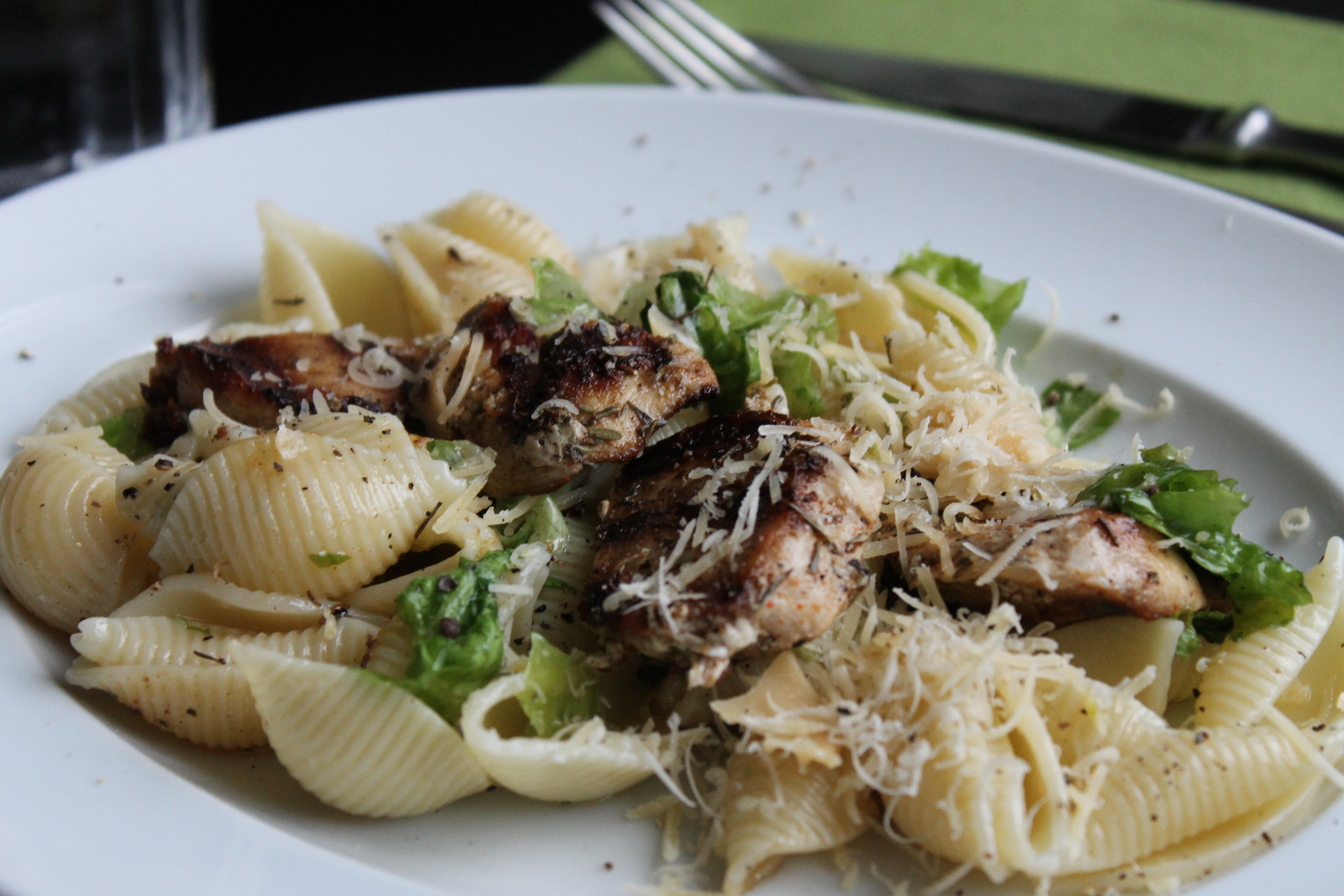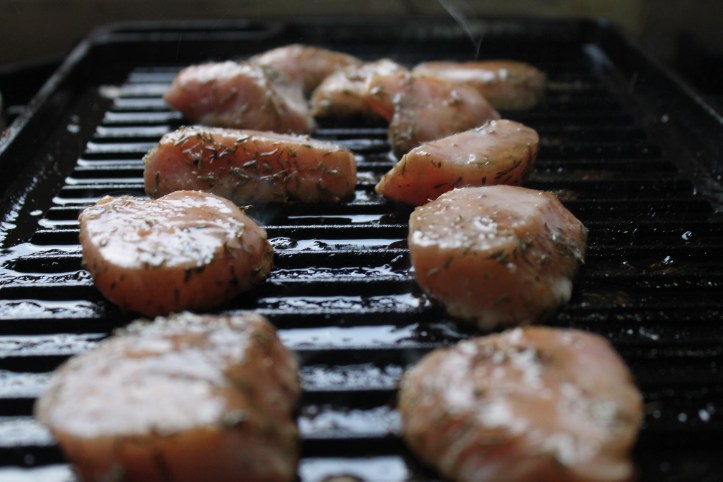 Ég hitaði vatn í potti og saltaði það, setti pasta (ég notaði skeljar) út í og sauð þær samkvæmt leiðbeiningum á umbúðum. Á meðan hitaði ég grillpönnu (má líka vera venjuleg) vel, setti kjúklingasneiðarnar á hana og steikti þær við fremur háan hita í svona 3 mínútur.