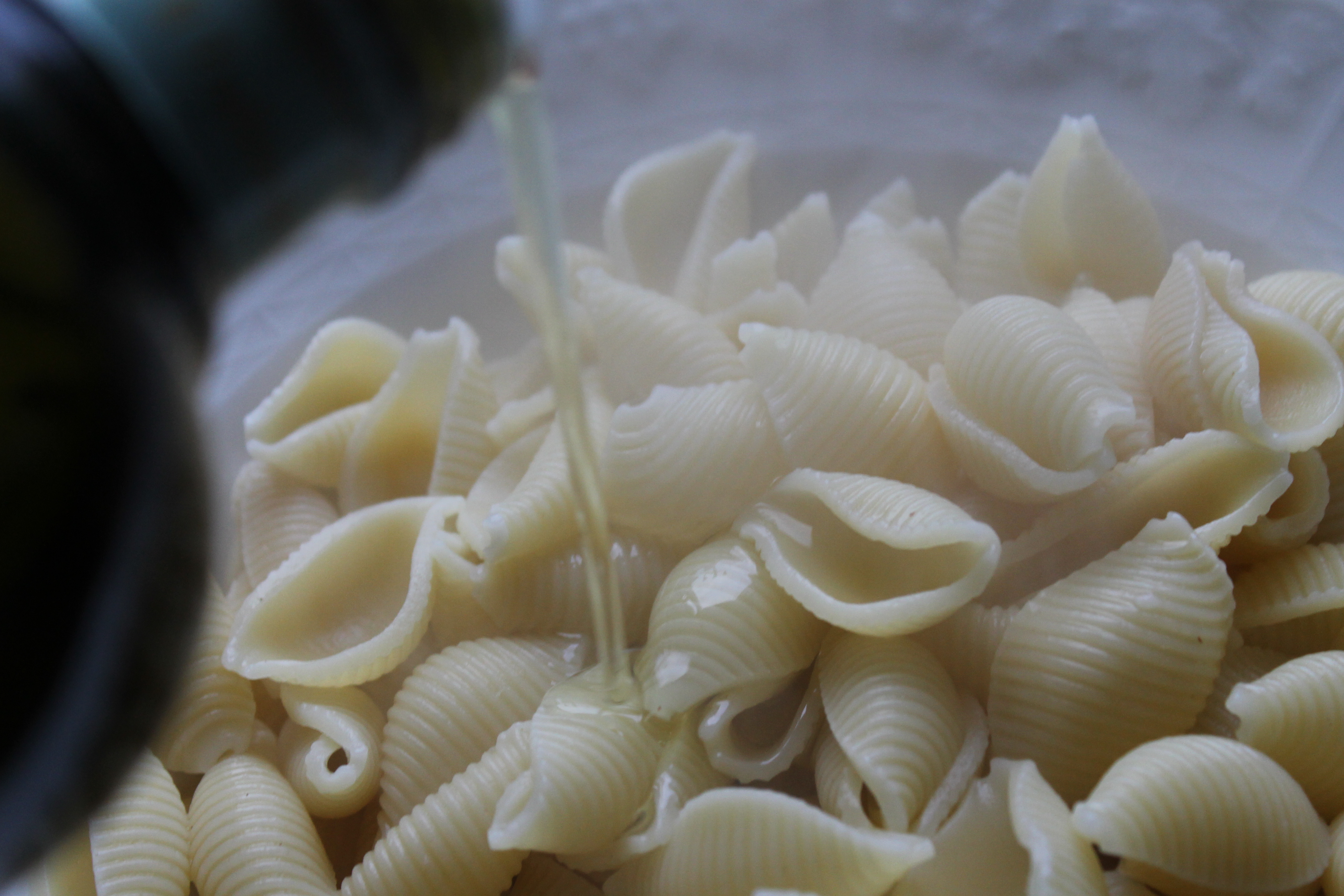 Þá var pastað einmitt hæfilega soðið og ég tók svolítið af pastasoðinu frá em hvolfdi svo úr pottinum í sigti, lét renna af pastanu, setti það í skál og hellti 1-2 matskeiðum af ólífuolíu yfir og blandaði vel. Tók svo væna lúkufylli af salatblöðum (lambhagasalat, minnir mig, en má vel vera annað), saxaði gróft og blandaði saman við sjóðheitt pastað. Bætti við smáskvettu af pastasoði.
