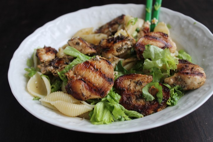 Svo setti ég pastasalatið í skál með kjúklingasneiðunum. Það sakar ekkert að bæta við nokkrum basilíkublöðum ef maður á þau.