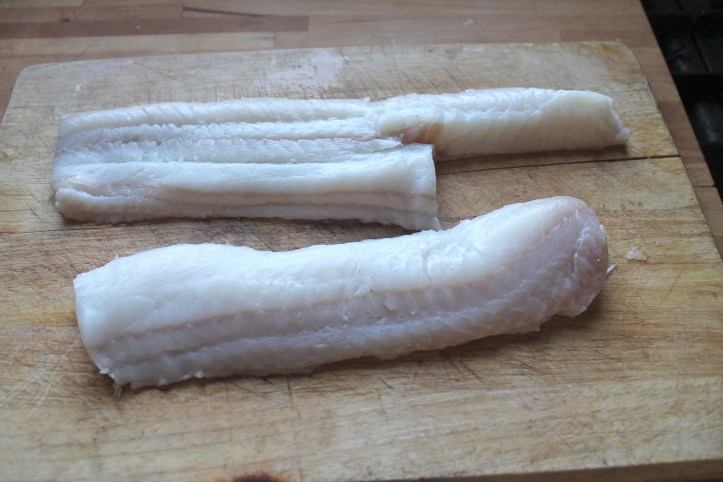Ég var með steinbítsflak, um 600 grömm (fyrir 7) og skar það í 8 bita (einn auka til öryggis, ef ég skyldi til dæmis missa einn í gólfið …).
