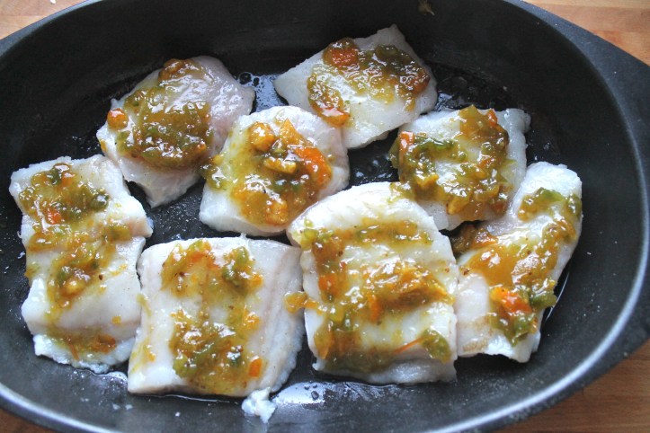 Ég kryddaði fiskinn með pipar og salti. Hellti svolítilli olíu í eldfast mót, velti fiskbitunum upp úr henni og raðaði þeim svo í mótið og dreifði dálitlu af tómat- og appelsínumarmilaðinu sem ég var með uppskrift að hér um daginn yfir. Það má alveg nota ýmislegt annað í staðinn, marmilaði (þó helst ekki of sætt, ég átti einu sinni límónumarmilaði sem ég notaði með mjög góðum árangri í svona), eitthvert kryddmauk eða mangó-chutney, til dæmis.