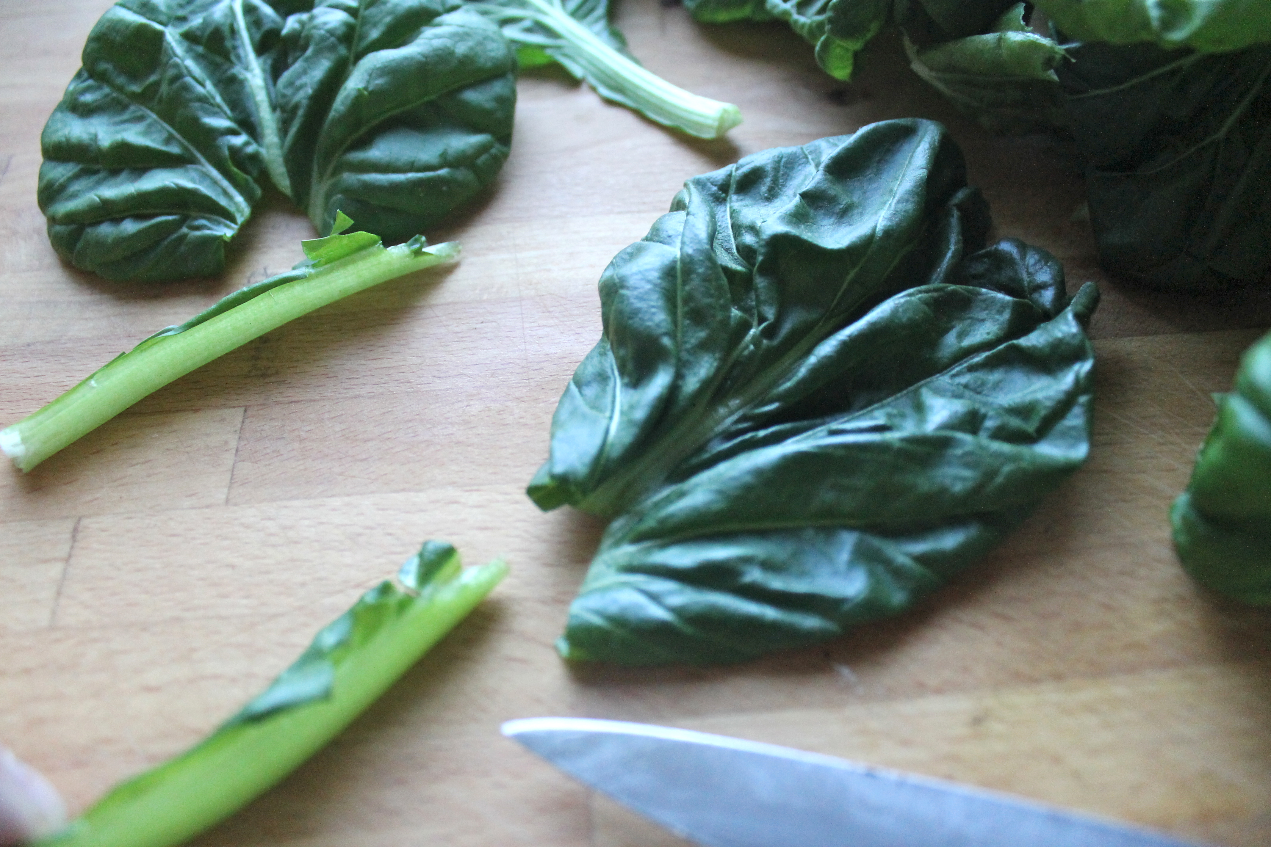 Þar sem ég hafði smurt sætu marmilaði á steinbítinn fannst mér betra að hafa eitthvað svolítið súrt til mótvægis, þó ekki of, svo að ég keypti fjallaspínat í Bónus. Leggurinn á því er sver og mikill en nær ekki langt upp í blaðið. Ég skar leggina úr og skar þá svo í litla bita.