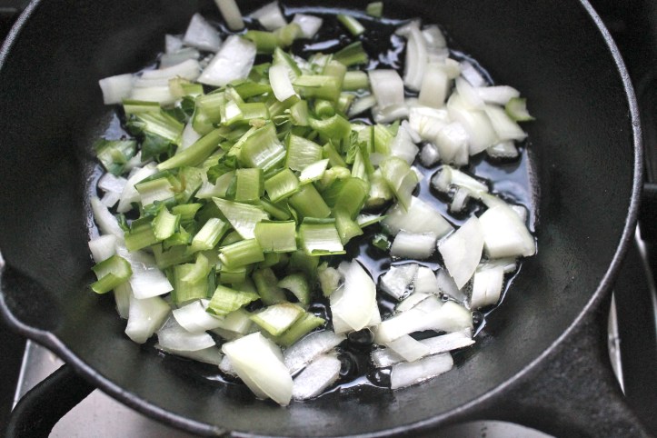 Saxaði líka niður einn lauk, hitaði svolitla olíu á pönnu og lét lauk og spínatstilka krauma í henni í nokkrar mínútur við fremur vægan hita.