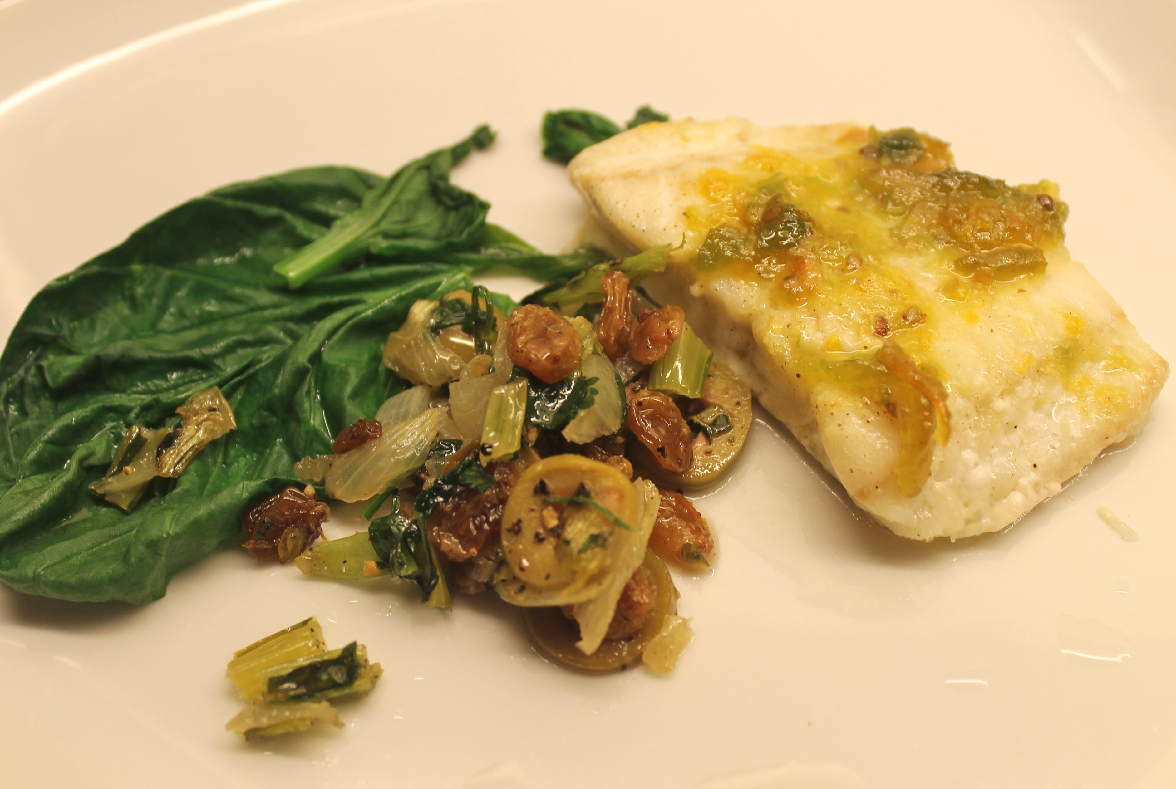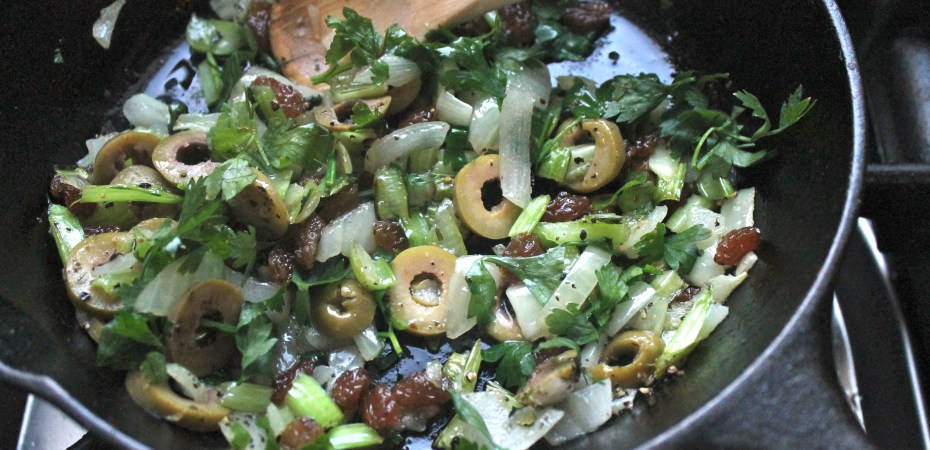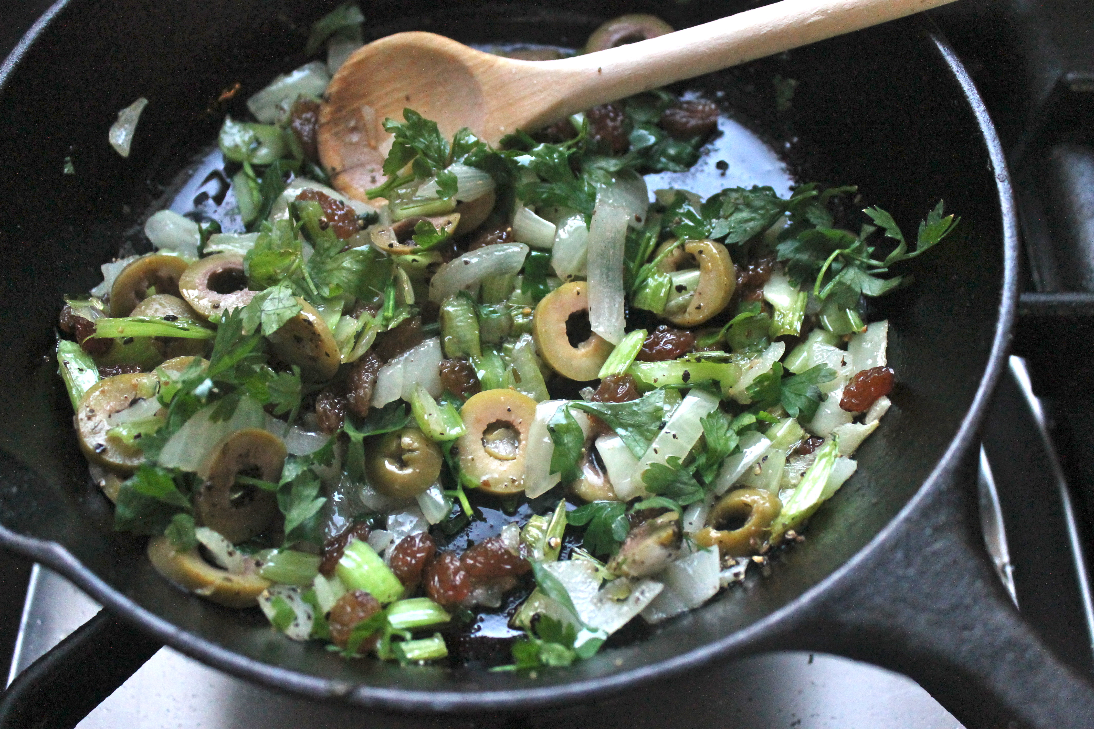 Ég skar nokkrar steinlausar ólífur í sneiðar, setti þær á pönnuna ásamt smávegis af rúsínum (þessar eru ljósar en það er ekki nauðsynlegt), kryddaði með pipar og salti og lét krauma í nokkrar mínútur í viðbót. Þá hrærði ég dálítilli saxaðri steinselju saman við og tók pönnuna af hitanum. Þetta má líka búa til með nokkrum fyrirvara og geyma.