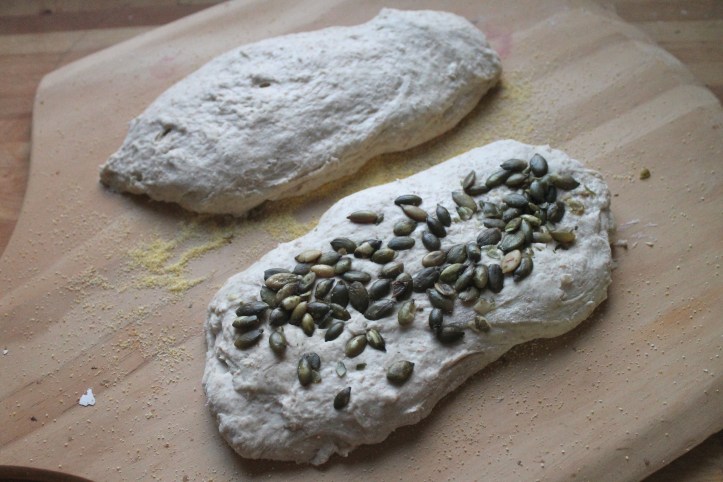 Ég byrjaði á að baka brauð úr deigi sem ég átti í ísskápnum – þetta er deig sem er brauðhveiti og heilhveiti til helminga. Ég mótaði tvö aflöng brauð, lét þau lyfta sér og stráði ögn af hveiti á annað en graskersfræjum á hitt. Lét þau lyfta sér, renndi þeim svo yfir á hitaðan leirplatta og bakaði þau við 240°C í um 25 mínútur.