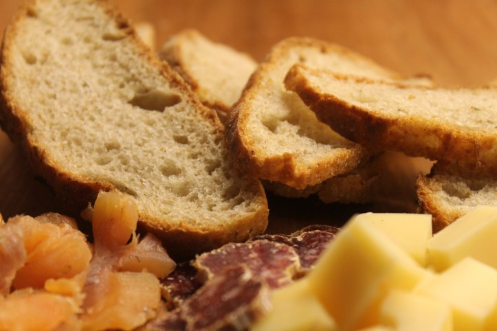 Svo skar ég brauðið í þunnar sneiðar og bar það fram með reyktum silungi, ítalskri pylsu, PrimaDonna-osti og hráu taðreyktu hangikjöti (sem kláraðist og er því ekki með á myndinni).